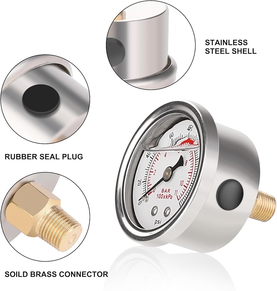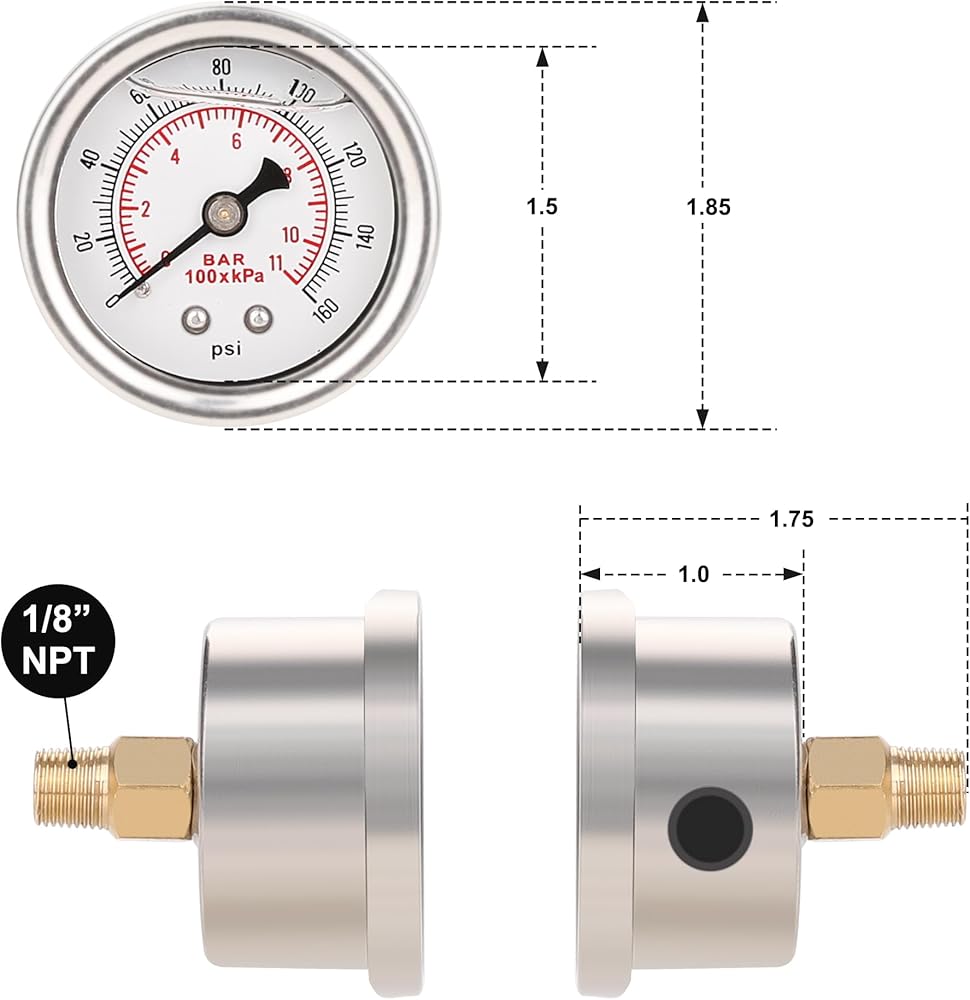 • مقياس امتلاء السائل - تم تصميم أجهزة قياس الضغط لقياس ضغط الغاز والسائل الذي لا يسبب تآكل النحاس. يوفر السائل توسيدًا كبيرًا لتقليل رفرفة المؤشر والأضرار الداخلية. تُظهر لك إبرة قياس الضغط القراءة الدقيقة، ويمكنك تنظيم الضغط حسب احتياجاتك. يمكن استخدامه في أي مكان يكون فيه منفذ 1/8 NPT مفتوحًا!