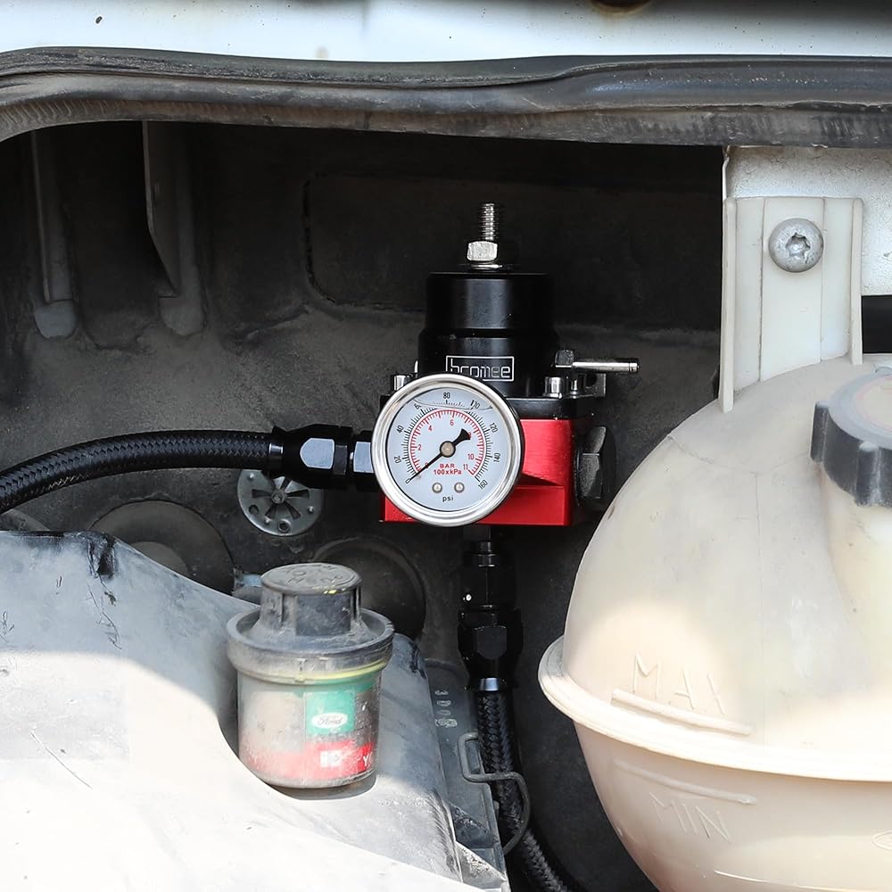 طقم منظم ضغط الوقود من الألومنيوم العالمي القابل للتعديل باللون الأسود والأحمر من Hromee مع إرجاع تجاوز 0-160 رطل لكل بوصة مربعة، مقياس ضغط مملوء بالسائل 1.5 بوصة، 4 قطع محول خرطوم مناسب