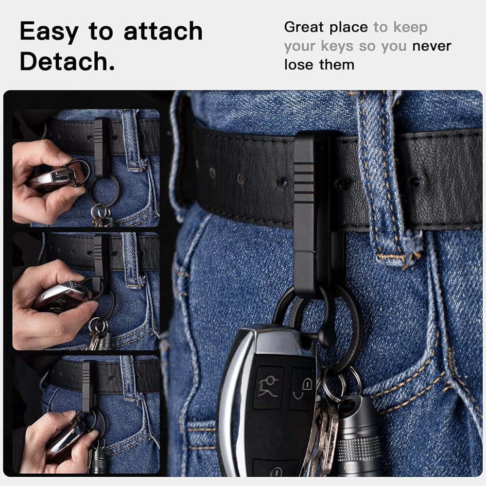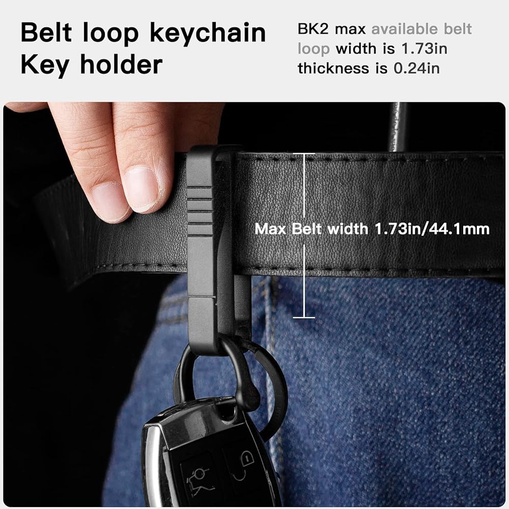 • مشبك سلسلة مفاتيح حزام فاخر: مشبك زنبركي مدمج، يصعب تشويهه، يمكنه تجهيز 4-6 حلقات سلسلة مفاتيح، للأحزمة بعرض أقصى 1.77 بوصة (45 مم) وسمك 0.25 بوصة (6.35 مم)، عليك إطعام الحزام من خلاله، لذا لا تقلق بشأن انزلاق سلسلة المفاتيح من حزامك