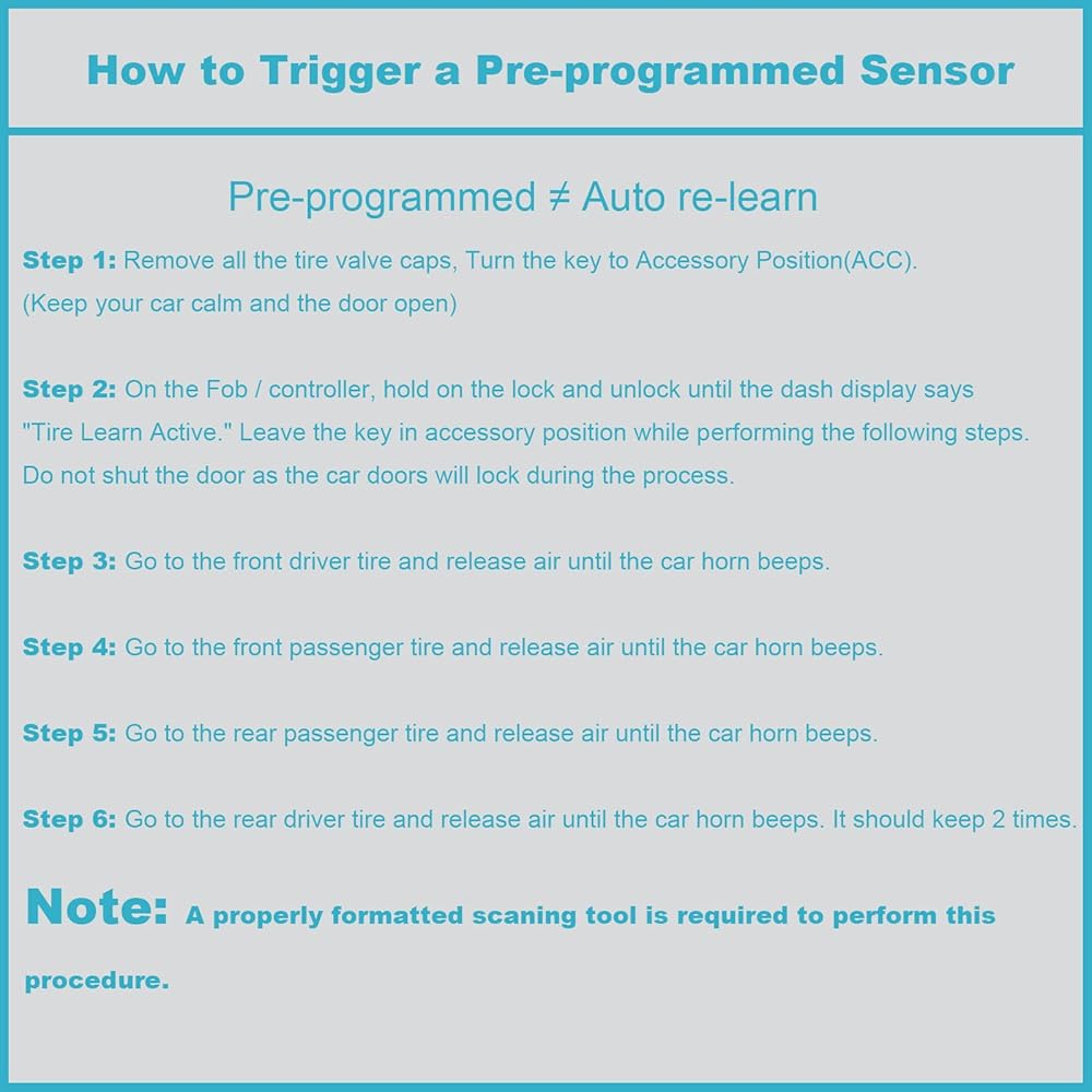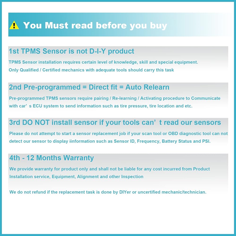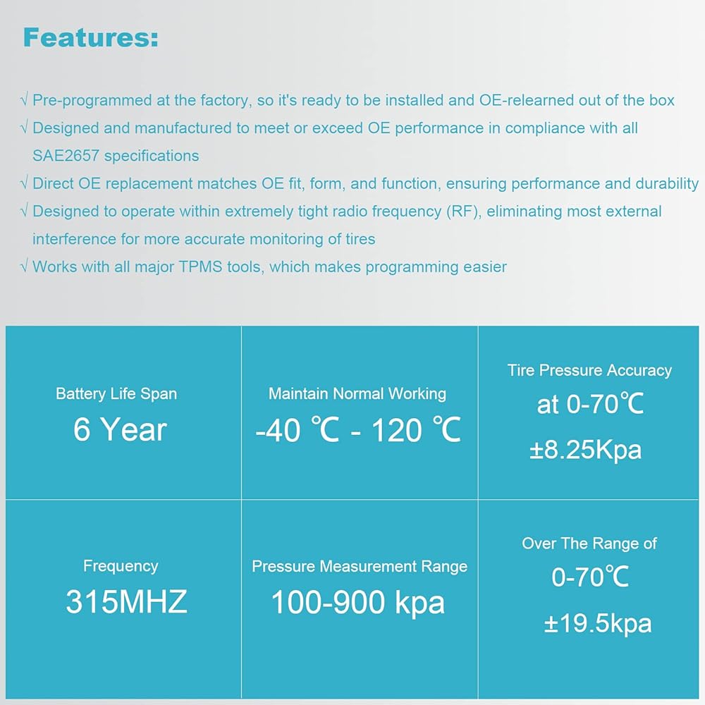 【جودة ممتازة】: يتميز مستشعر نظام مراقبة ضغط الإطارات (TPMS) بتصميم فريد من قطعتين يسمح باستبدال ساق الصمام بشكل مستقل عن المستشعر. يوفر المستشعر أيضًا جذعًا بزاوية قابلة للتعديل، لذلك يتم ضمان الملاءمة الدقيقة. وبالمثل، يتم ضمان الوظيفة المناسبة: على الرغم من أن شكل ولون المستشعر قد يختلفان عن المستشعر المثبت في المصنع، إلا أن الإلكترونيات الداخلية مخصصة لسيارتك المحددة، وسوف توفر نفس الخدمة مثل الأصلية.