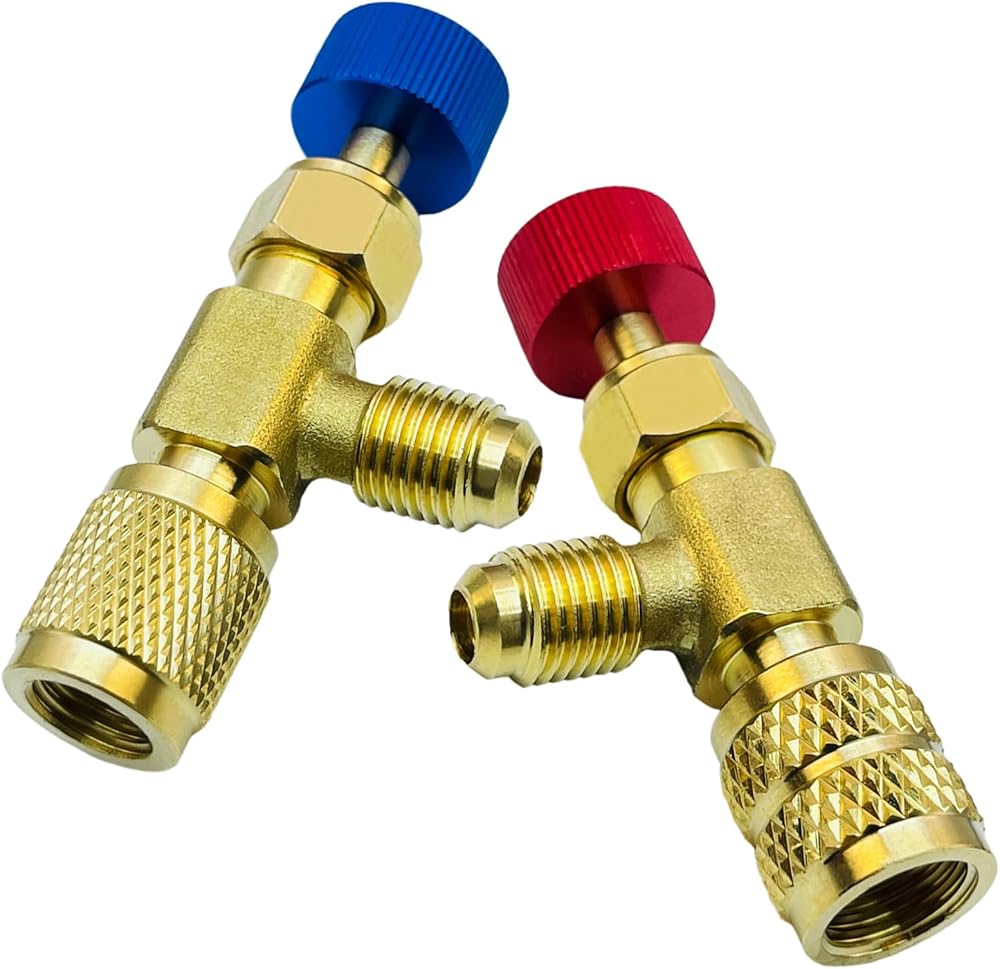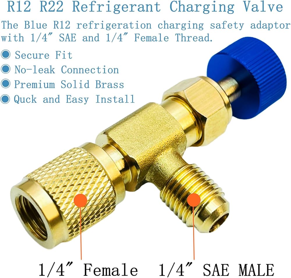 [WIDE APPLICATION] The R12 AC flow control valve adapter fits for R12 R22 air conditioner manifold with 1/4" Male to 1/4" Female. The R410 Refrigerant Charging Valve manifold with 1/4" Male to 5/16" Female.