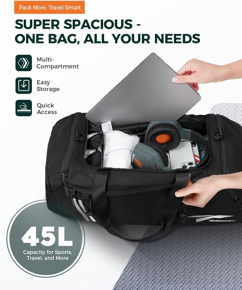 【حقيبة رياضية عالية الجودة】: مصنوعة من قماش أكسفورد RPET 900D عالي الجودة وسحاب ناعم، مقاس 60 × 25 × 30 سم/1.25 كجم (45 لتر). السعة الكبيرة والجيوب المتعددة تكفي لحمل الأغراض لمدة 4 أيام، على سبيل المثال: الخيمة/حقيبة النوم/حصيرة اليوغا، أعمدة/مضارب المشي لمسافات طويلة، الملابس، أحذية المشي لمسافات طويلة، iPad، Macbook، زجاجة المياه، أدوات النظافة، إلخ.
