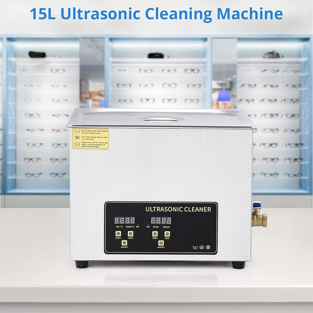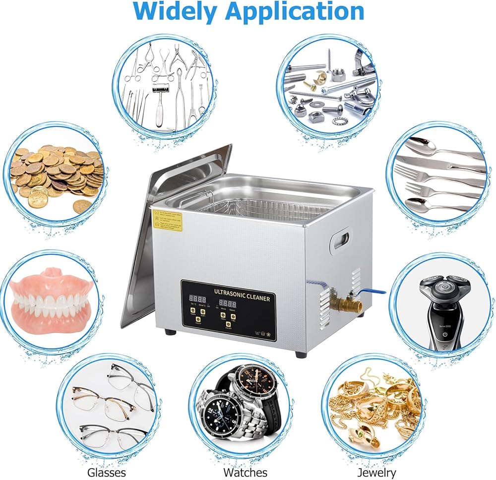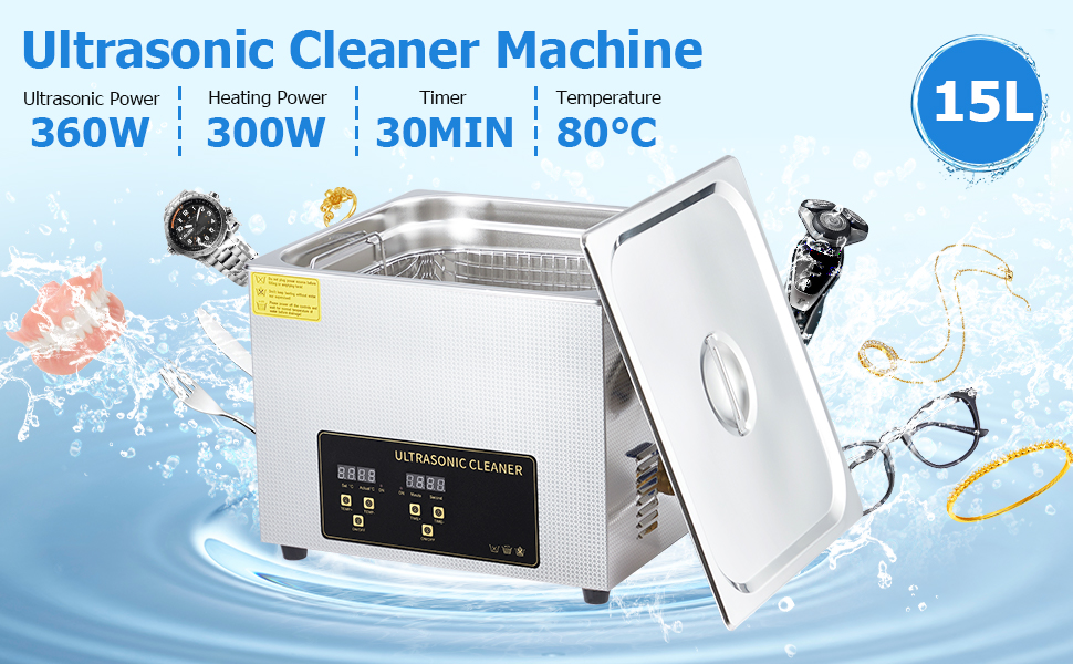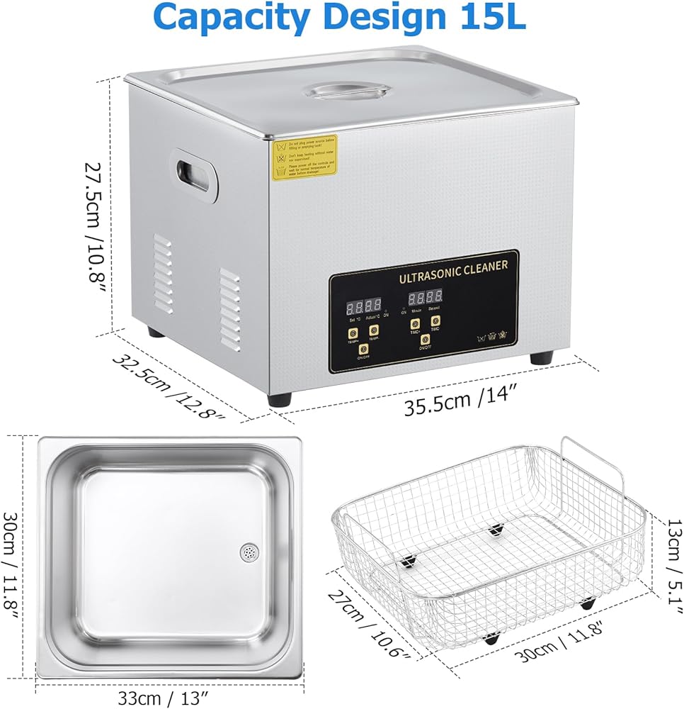 [سعة كبيرة] تحتوي آلة التنظيف بالموجات فوق الصوتية على سعة خزان مياه 15 لتر، 33*30*15 سم (13 بوصة*11.8*6). يمكن لمنظف الأجزاء بالموجات فوق الصوتية ذو السعة الكبيرة أن يرضيك لتنظيف المزيد من العناصر وتوفير وقتك وطاقتك.
