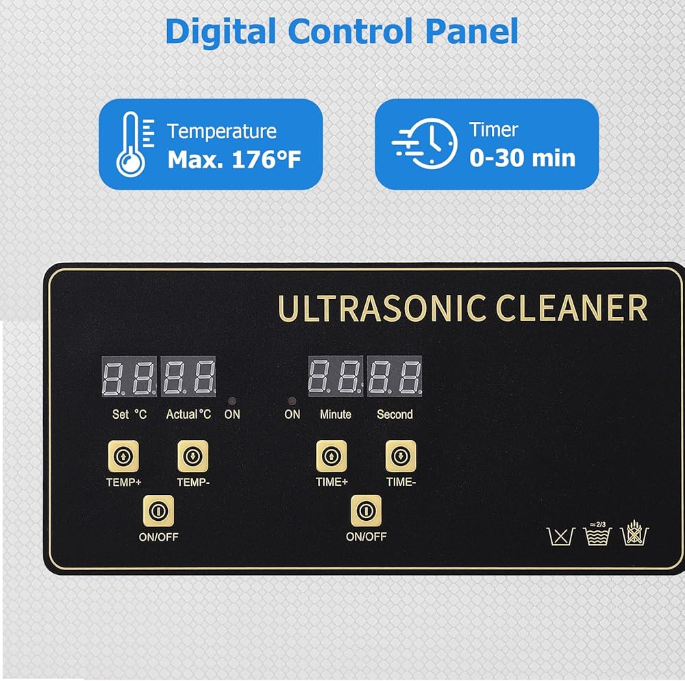 [سهلة الاستخدام] تم تجهيز آلة التنظيف بالموجات فوق الصوتية بلوحة تحكم رقمية تسهل على العملاء إجراء إعدادات دقيقة للوقت ودرجة الحرارة. الوقت: 0-30 دقيقة، درجة الحرارة: 0-80 درجة مئوية/176 درجة فهرنهايت.