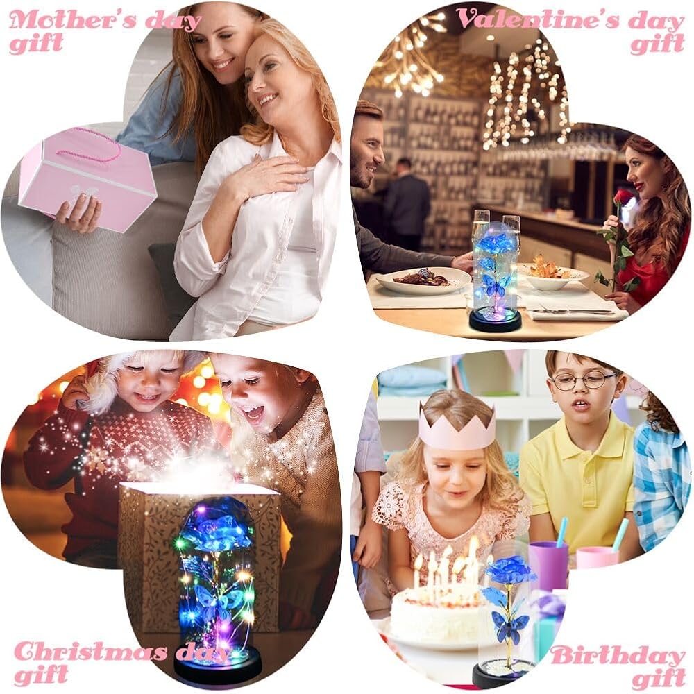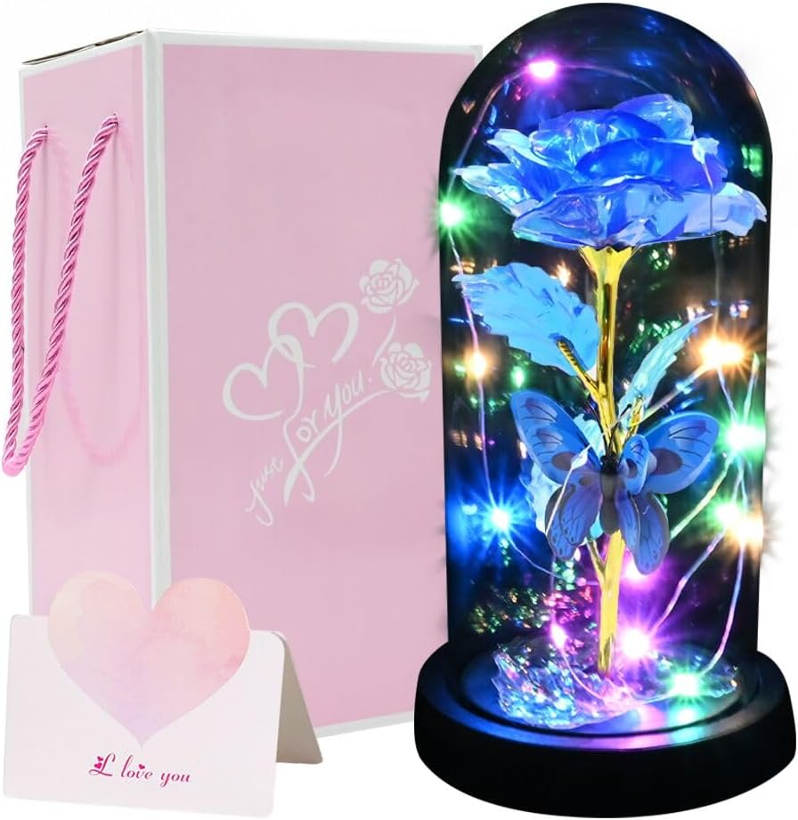 Mothers Day Rose Flower Gifts for Mom from Daughter, Galaxy Blue Butterfly Rose in Glass Dome Light up Artificial Flower Rose, Eternal Glass Rose Womens Gift for Mother Day Anniversary Birthday