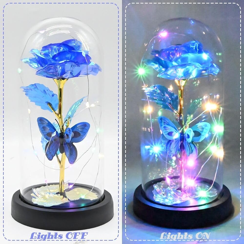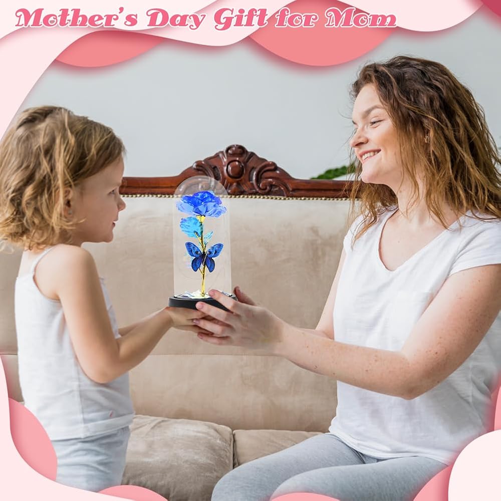 عيد الأم هدايا زهرة الورد للأم من ابنتها، وردة الفراشة الزرقاء المجرة في قبة زجاجية تضيء زهرة الورد الاصطناعية، وردة زجاجية أبدية هدية للمرأة لعيد الأم والذكرى السنوية لعيد الميلاد
