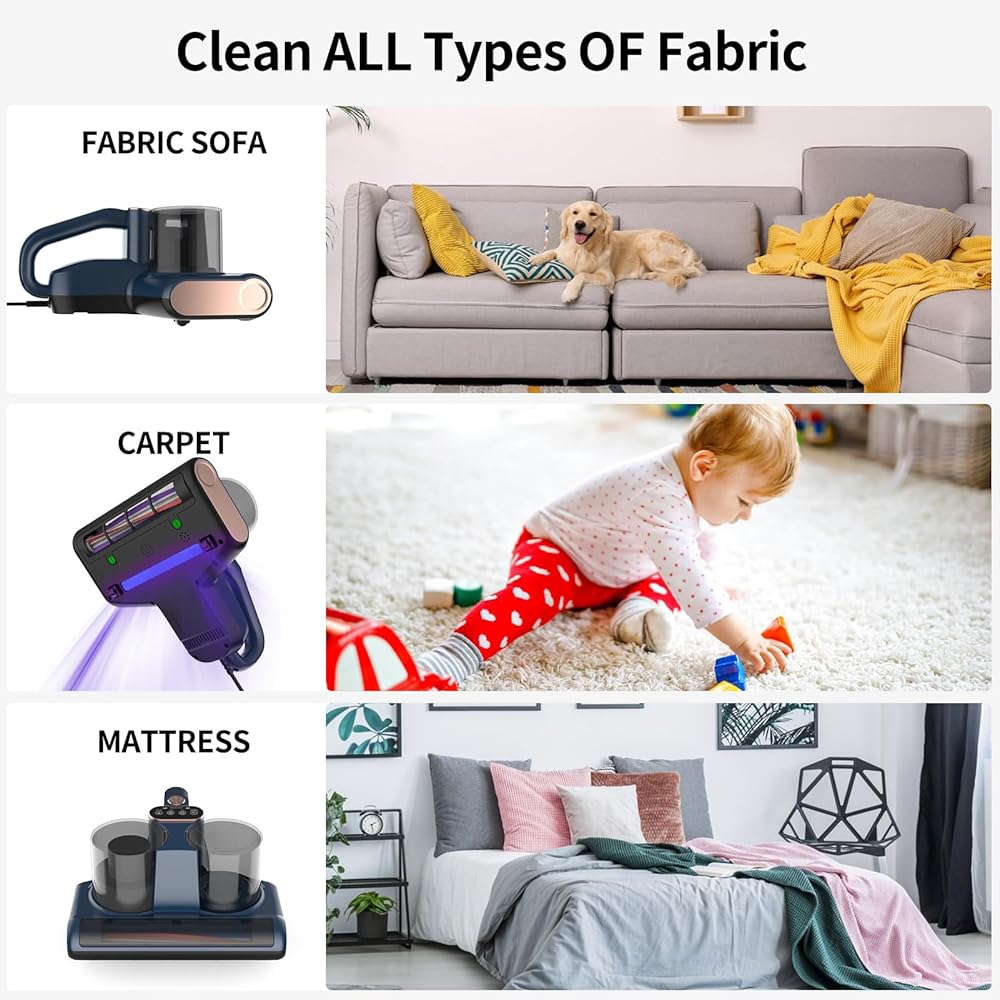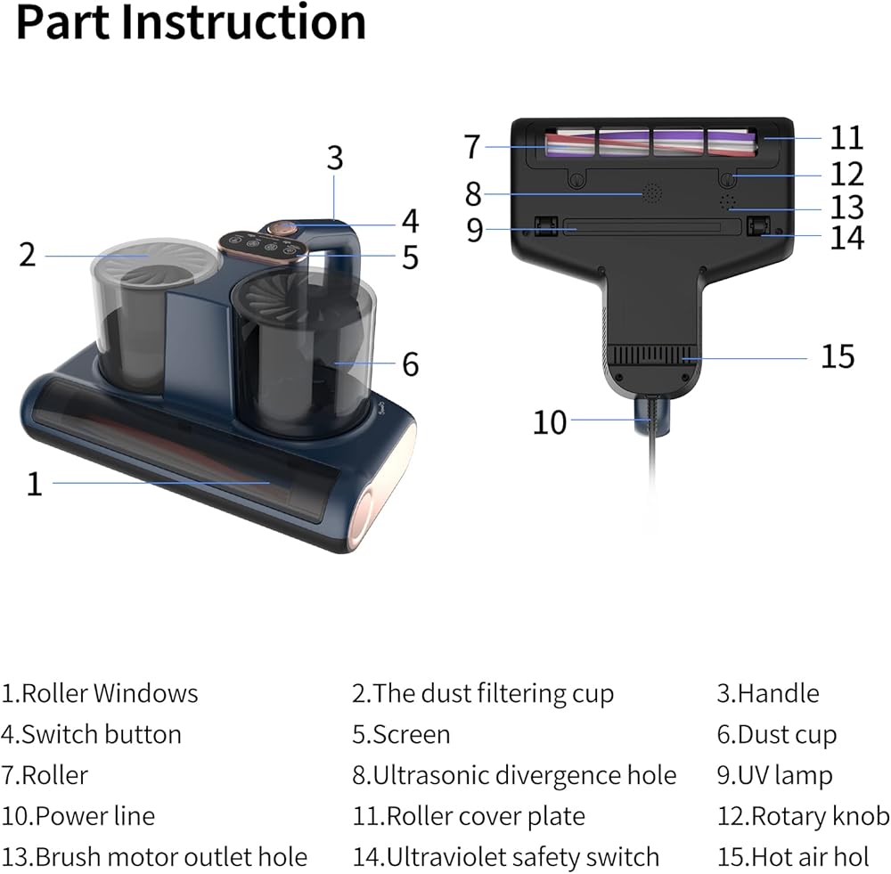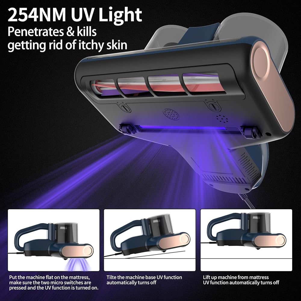 🌙[اختراق قوي] يمكن للضوء الأرجواني 253.7 نانومتر أن يدمر الأوساخ بشكل فعال ويحسن معدل التنظيف. الهواء الساخن المنبعث من الجزء السفلي من المكنسة الكهربائية للسرير سوف يزيل رطوبة الفراش بشكل فعال.