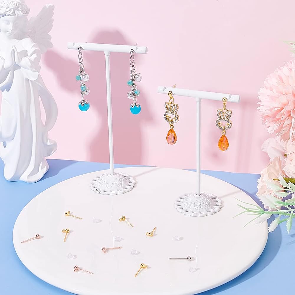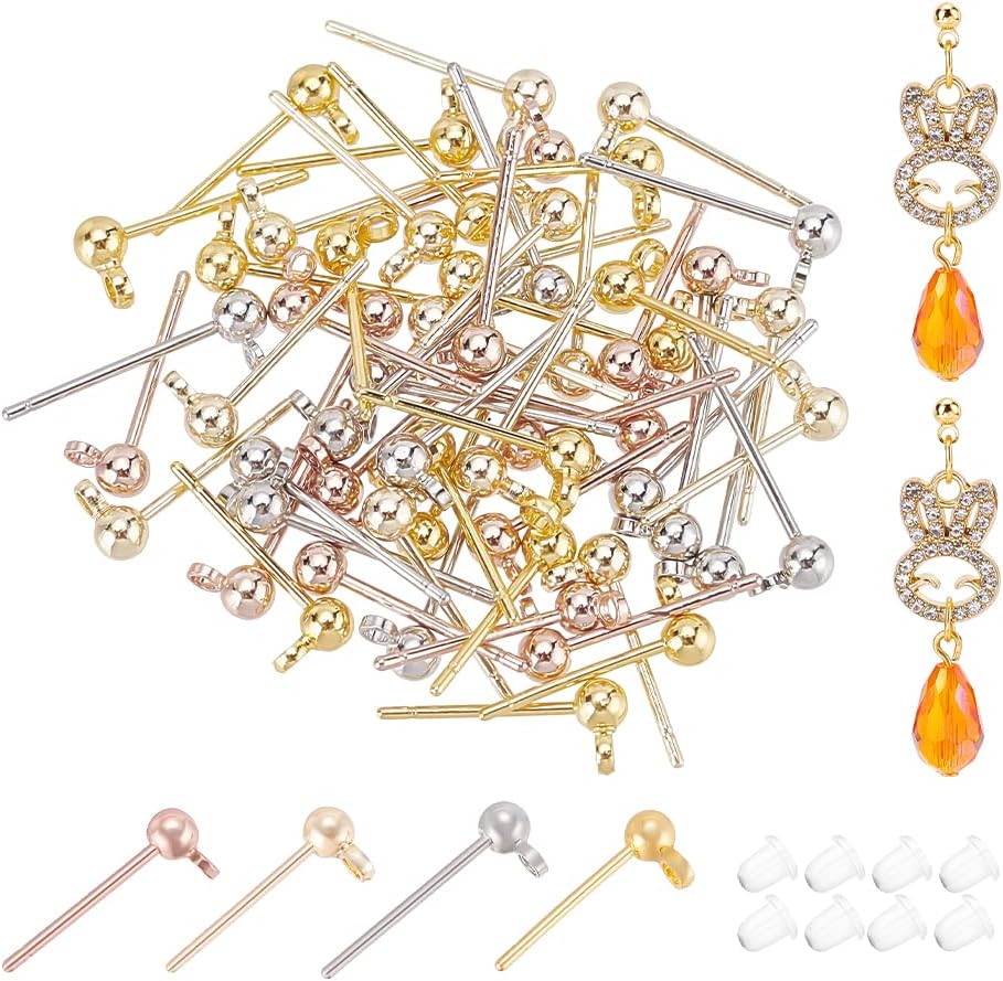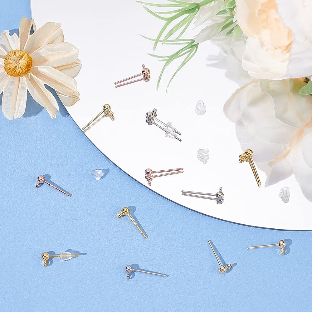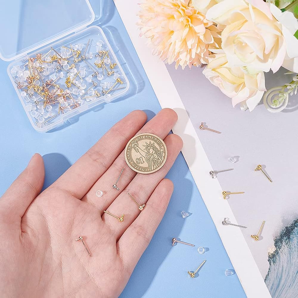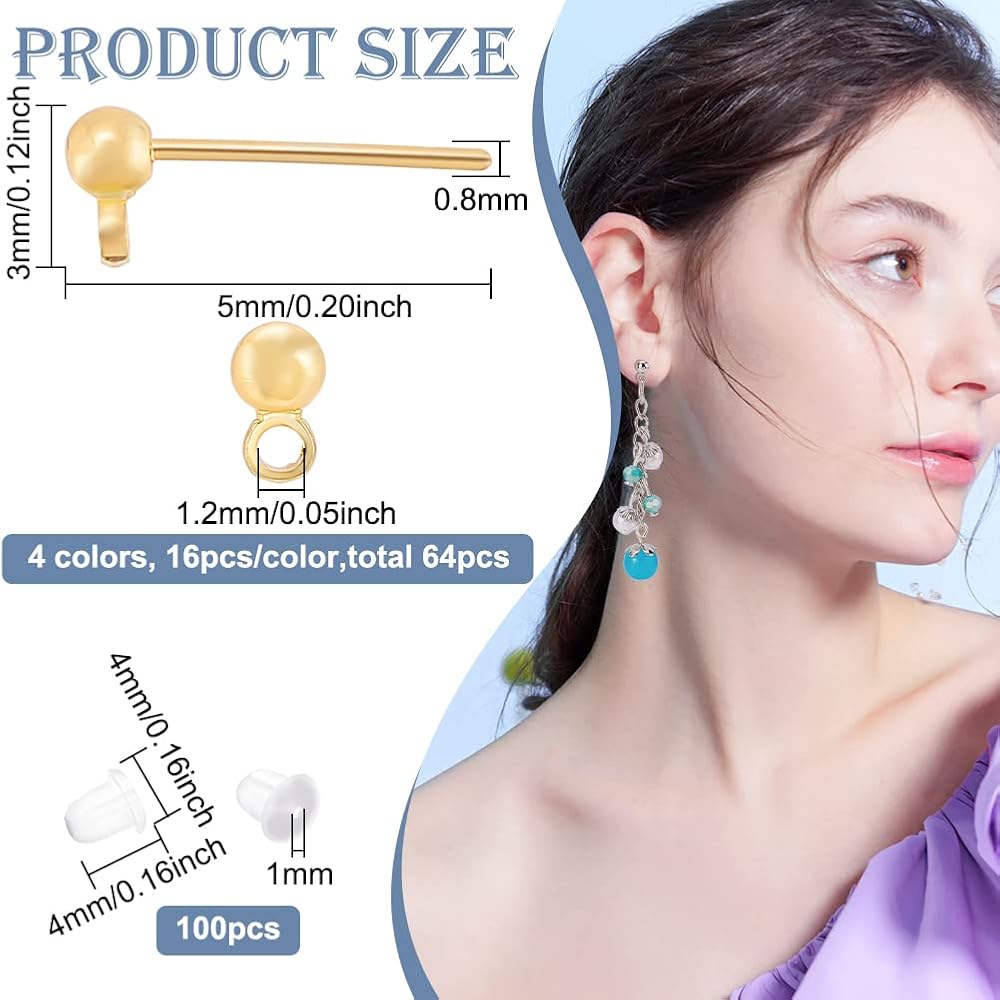Package Includes: 64 pcs gold plated earrings, about 5x3mm, hole: 1.2mm. pin: 0.8mm, plastic earrings: about 4x4mm, hole: 1mm, 100 pcs; enough for your daily wear. Includes four colors: gold, silver, rose gold and light gold.
