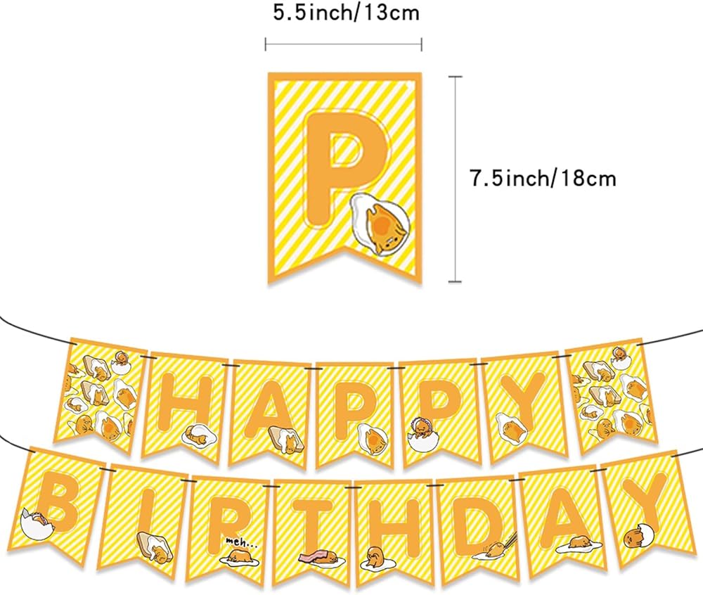 • Complete birthday decoration kit:Gudetama birthday party supplies include a set of "happy birthday" letter banner featuring the characters of "Gudetama" ,18Gudetama theme balloons,1Gudetama cake topper,12Gudetama cupcake toppers.