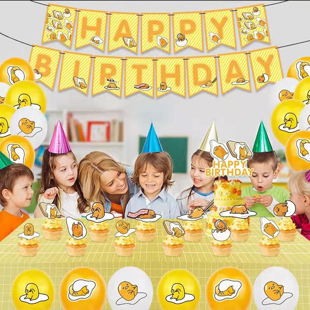32 قطعة من لوازم حفلات أعياد الميلاد من Gudetama مجموعة هدايا للحفلات للأطفال من Gudetama لتزيين الكيك وأغطية الكب كيك والبالونات لتزيين حفلات أعياد الميلاد من Gudetama
