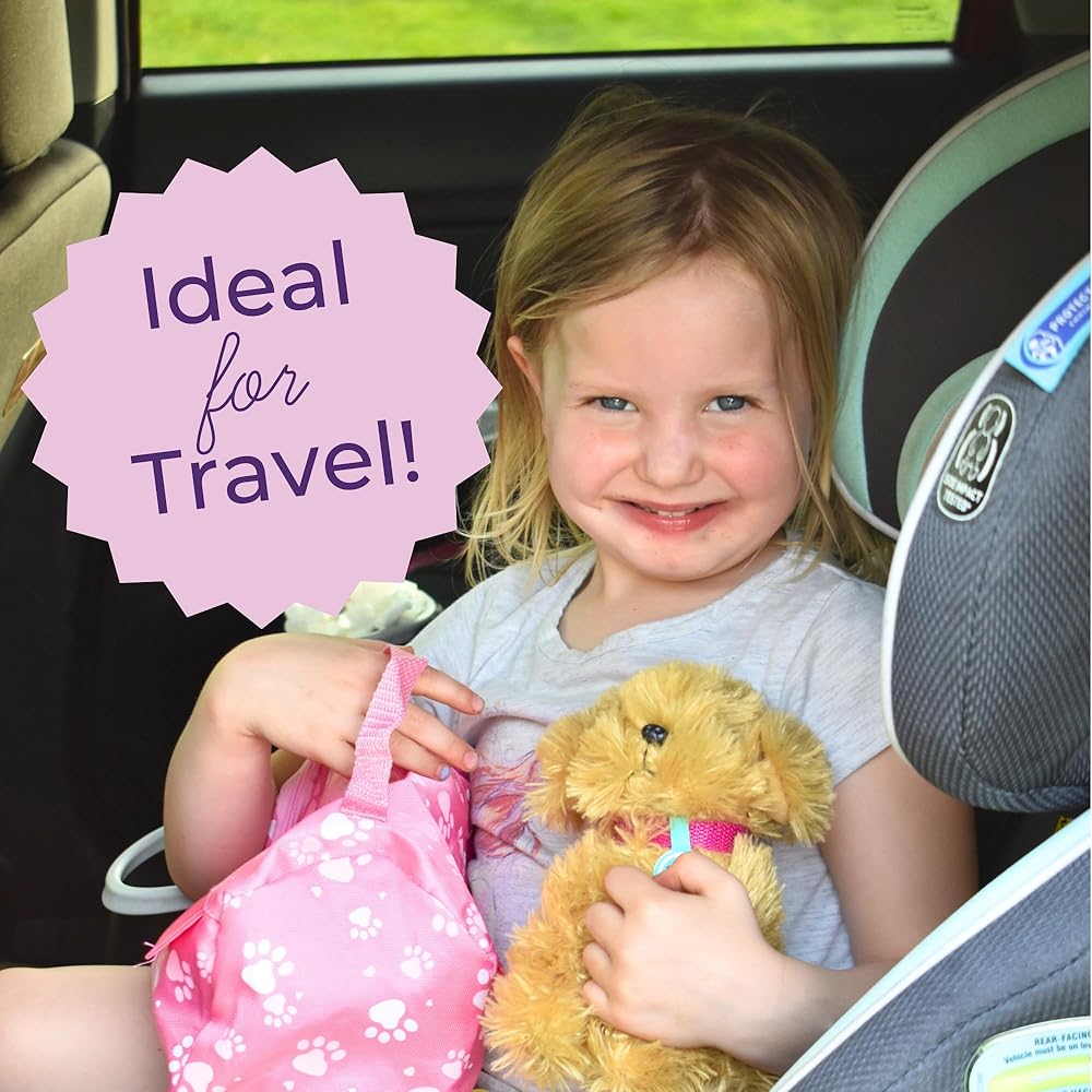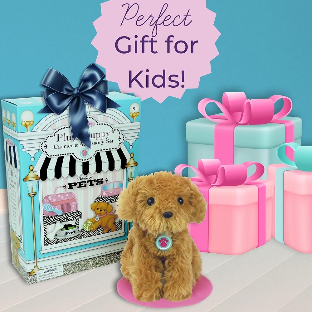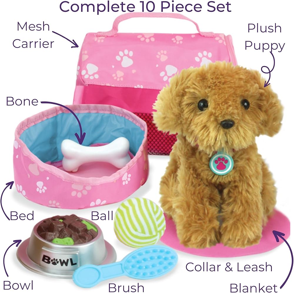 • مجموعة الكلاب الفاخرة من الدمية: تشتمل على كلب جرو قطيفة مقاس 6 1/2 بوصة، وياقة، ومقود، ووعاء طعام، وفرشاة، وكرة لعبة، وعظمة لعبة، وسرير جرو، وبطانية، وحامل، جميعها معبأة في صندوق مزخرف لطيف.