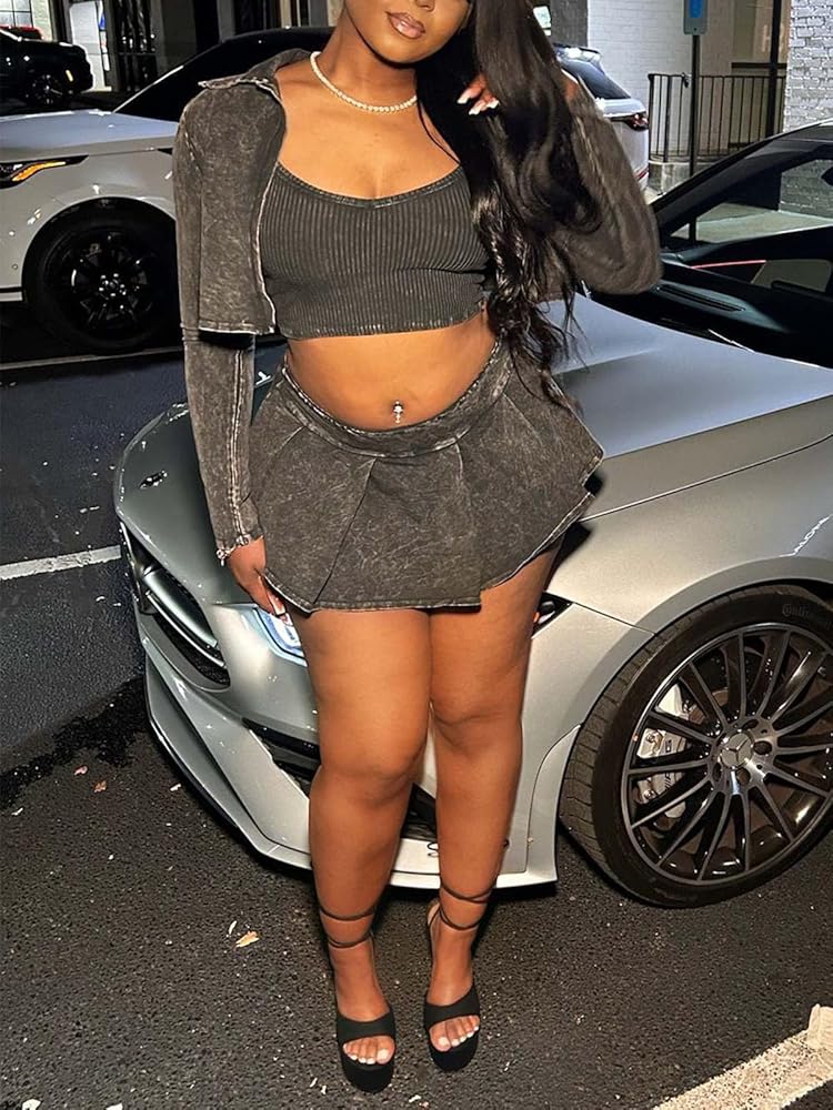 Feature: 3 piece outfits for women summer, skirts sets women 3 piece outfits, women high waisted y2k dress with tank top, turn down collar long sleeve denim jacket, mini length skirt, elastic pleated 3 piece lounge sets for women, three piece suits with stylish sexy cutting, long-sleeved open front blazer with ribbed crop top 3pc sets for women, 2 piece outfits for women sexy, track suits outfits for women 2 piece set.