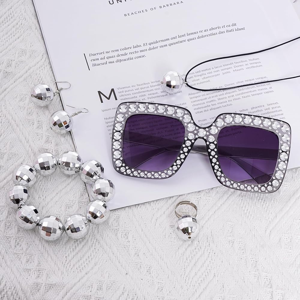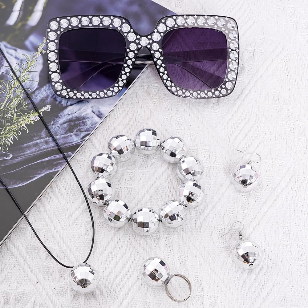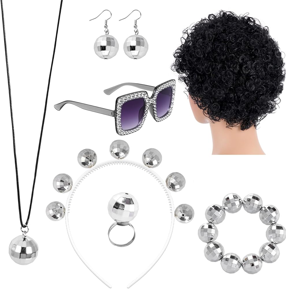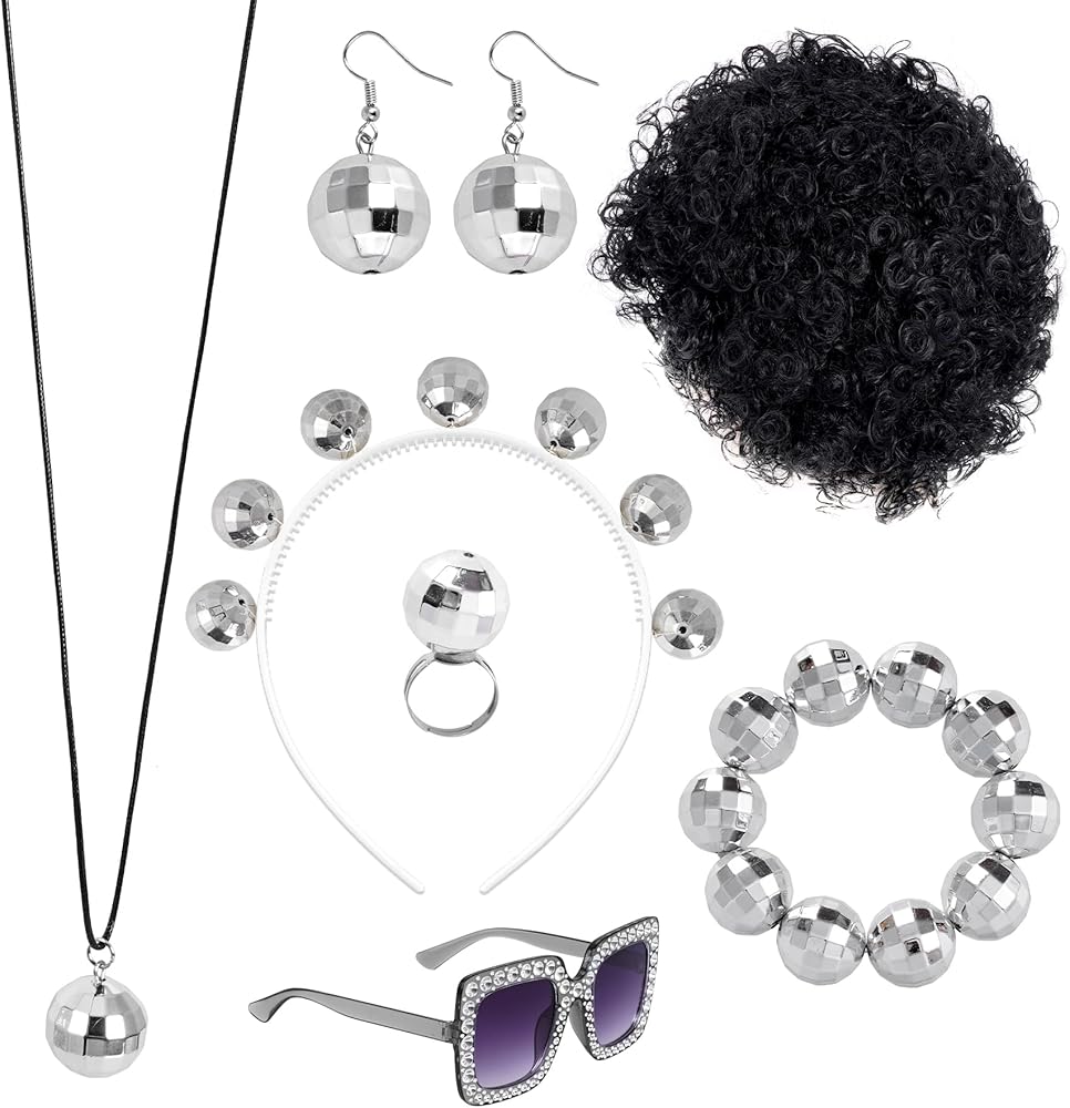 • 1970s Disco Accessories: You will get 7pcs silver disco accessories set including 1 x silver disco ball headband, 1 x disco ball necklace, 1 x disco ball bracelet, 1 x disco ring, 1 x disco Afro wig, 1 pair of disco ball earrings and 1 pair of square shape disco sunglasses, rich quantity can meet your decorative needs and create an attractive look, with our 7pcs silver disco accessories set, you will have a wide range of accessories to choose from.