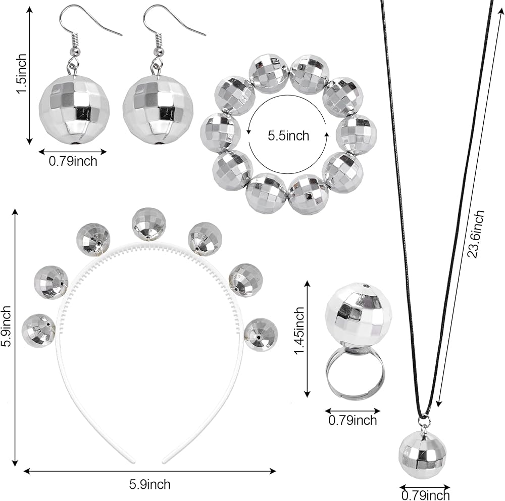 • 60s and 70s Retro and Vintage Disco Style: Our disco costume accessories set is vintage and classic, the disco balls are hollow, so the disco ball headband, bracelet, necklace, earrings and ring are lightweight, with the smooth surface and shining reflective mirrored design, our disco ball jewelries are exquisite,they can be worn together or separately and both look good, these jewelries can match with your outfit perfectly, making you more attractive and charming on the dancing floor.