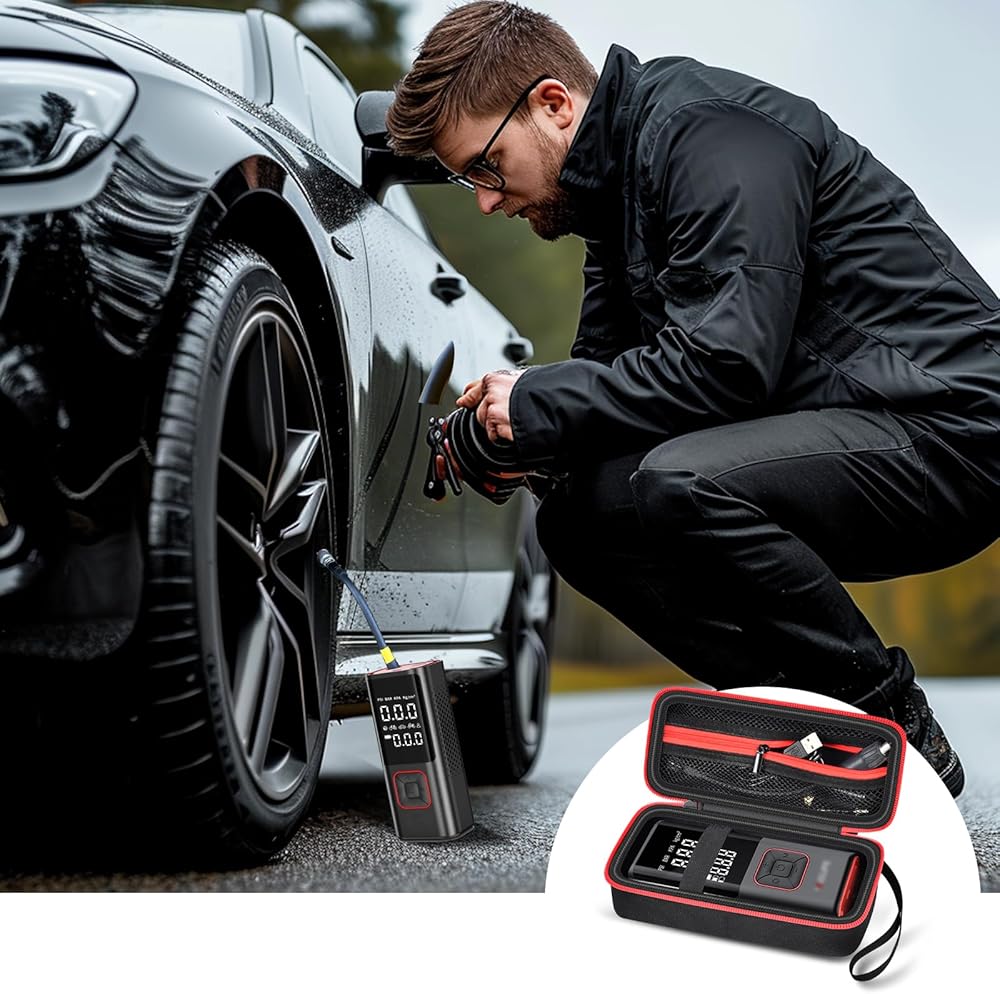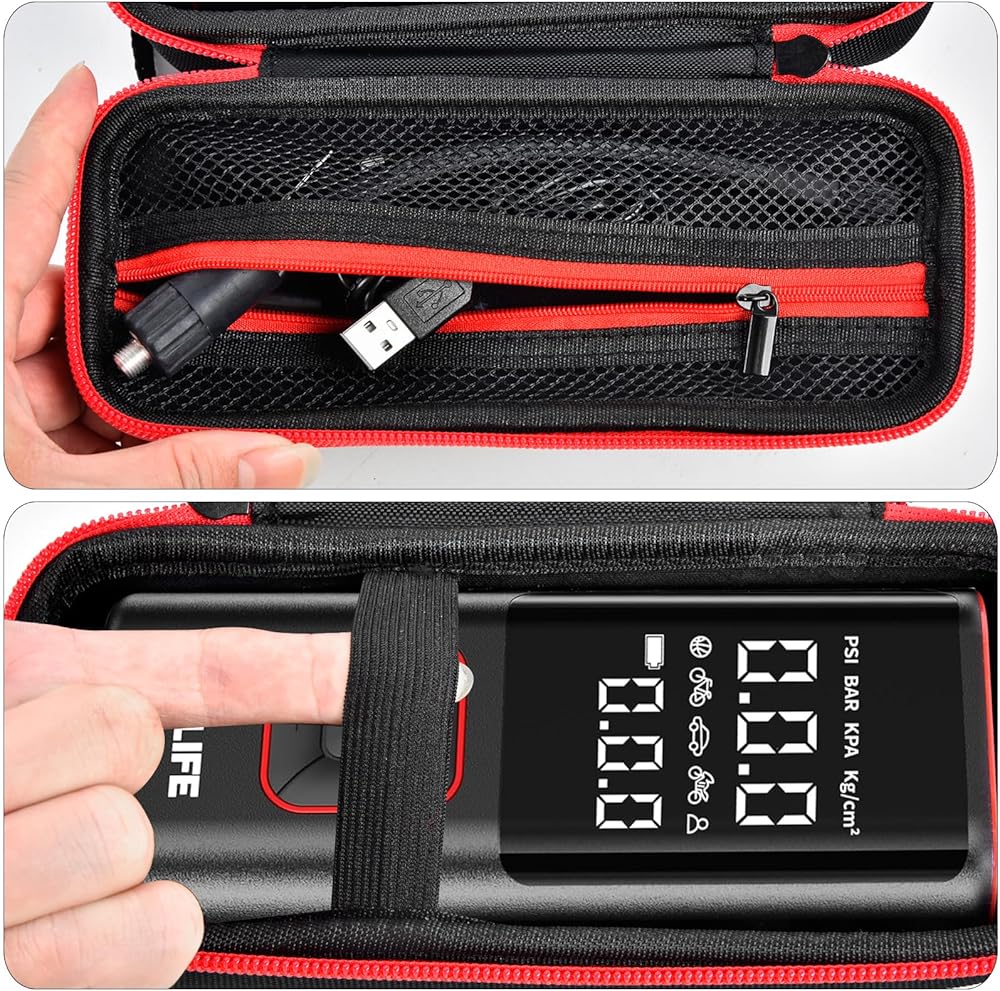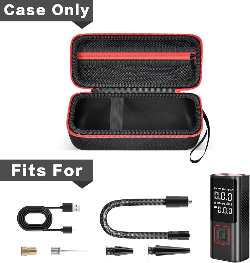 حافظة للبيع فقط - حقيبة قياس ضغط الإطارات هي إكسسوار مثالي لأي شخص لديه منفاخ إطارات قابل لإعادة الشحن. يوفر منظم مضخة الهواء بالبطارية مع ميزة الحماية الشاملة حلاً مثاليًا للتخزين. وهي تنتمي إلى هدية مرغوبة لعشاق الرياضة والمسافرين في أعياد الميلاد أو رأس السنة أو أعياد الميلاد وما إلى ذلك. ملحوظة: الجراب فقط معروض للبيع، لا يتضمن ضاغط هواء الدراجة النارية وملحقاته.