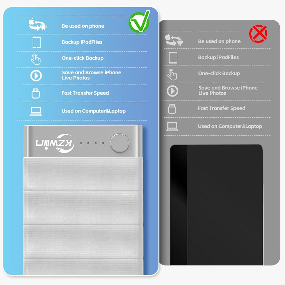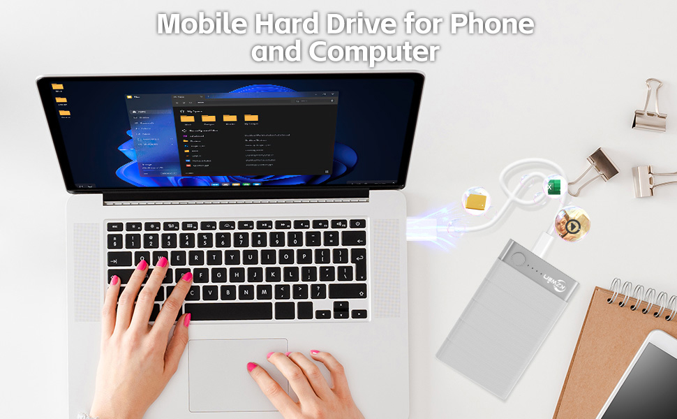توافق واسع: يدعم هواتف iPhone، وiPad، وهواتف Android، والأجهزة اللوحية، وأجهزة الكمبيوتر التي تعمل بنظام Windows وMacbooks، ويمكنك توصيل القرص الصلب بأجهزة مختلفة والنسخ الاحتياطي للملفات والعكس بالعكس.