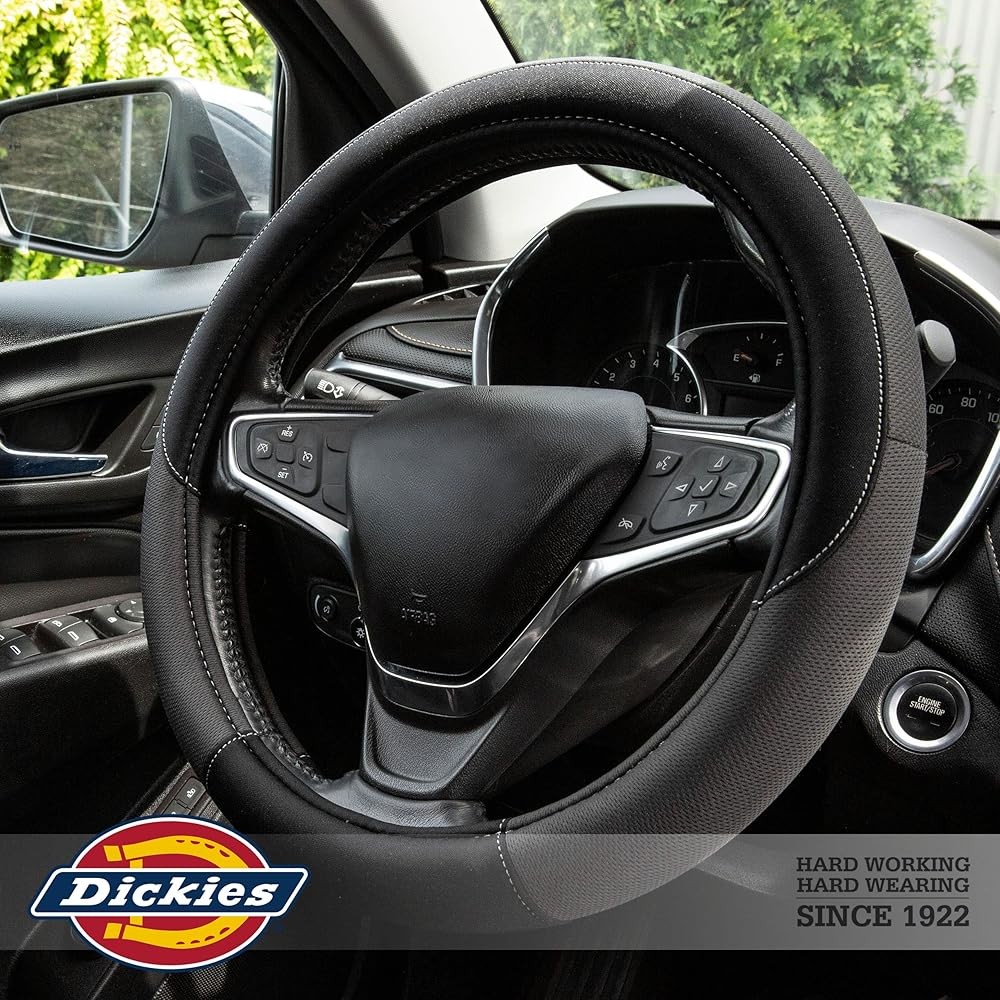 غطاء عجلة القيادة Dickies® Repreve®، صديق للبيئة، ملحقات داخلية أنيقة، سيارة معاد تدويرها، شاحنة، سيارات الدفع الرباعي، مناسب عالمي لعجلات القيادة مقاس 14.5 بوصة إلى 15.5 بوصة، (أسود/رمادي)