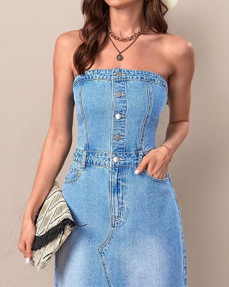 - الفستان العلوي بدون حمالات بدون ظهر، سحاب للإغلاق أو زر للإغلاق، تصميم بحاشية مقسمة، فستان من الدنيم لإظهار منحنيات جسمك الساحرة.