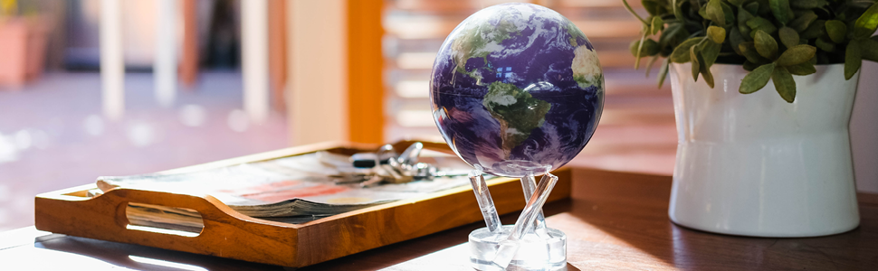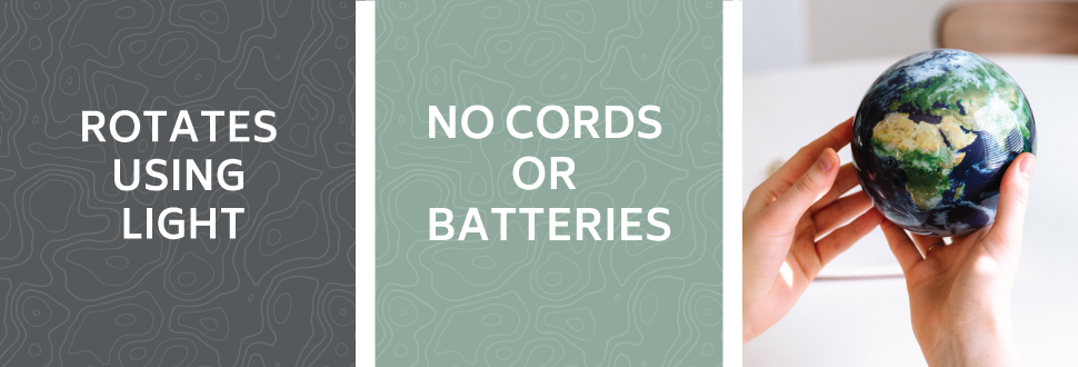 تستخدم MOVA Globes تقنية الخلايا الشمسية لتدور بصمت من تلقاء نفسها مع أي ضوء داخلي محيط أو ضوء الشمس غير المباشر، دون الحاجة إلى بطاريات أو أسلاك. توجد سوائل غير سامة بين أغلفة الأكريليك الداخلية والخارجية لتوفير بيئة منخفضة الاحتكاك