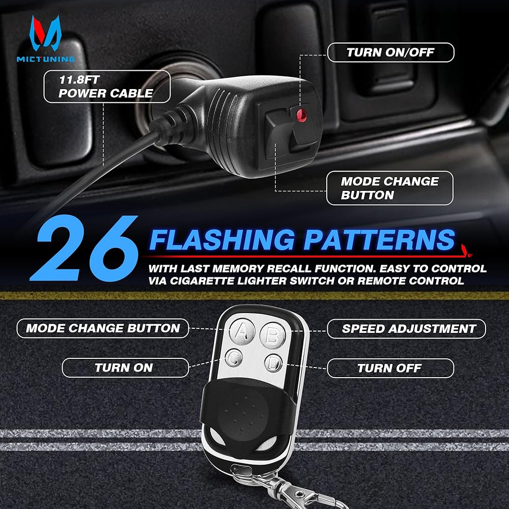 【طريقتان للتحكم】يوجد 26 نمطًا وامضًا مختلفًا مع وظيفة استدعاء الذاكرة الأخيرة. ما عليك سوى توصيل مفتاح ولاعة السجائر بجهد 12 فولت والتحكم في وضع الوميض. كما يمكنك استخدام جهاز التحكم عن بعد لتشغيل/إيقاف الأضواء وتغيير أوضاع الوميض وضبط السرعة، وهو مريح جدًا في الاستخدام.