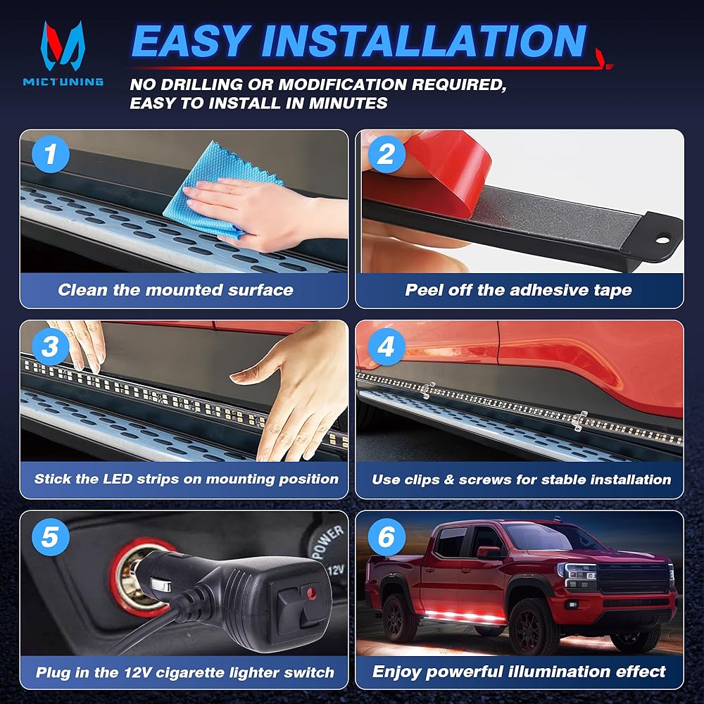【سهلة التركيب】لا تحتاج إلى ثقب، فقط قم بتنظيف سطح التثبيت، وقشر شريط أضواء LED القوية وألصقه. تضيف البراغي الإضافية والروابط المضغوطة ومشابك التثبيت مزيدًا من الثبات، فلا داعي للقلق بشأن السقوط. كابل الطاقة بطول 11.8 قدم طويل بما يكفي ليناسب معظم المركبات.