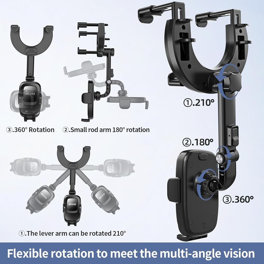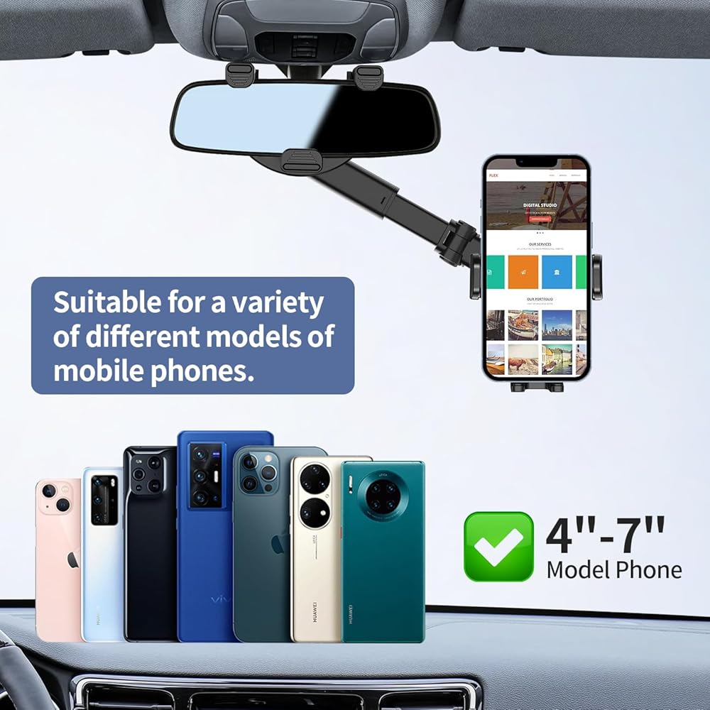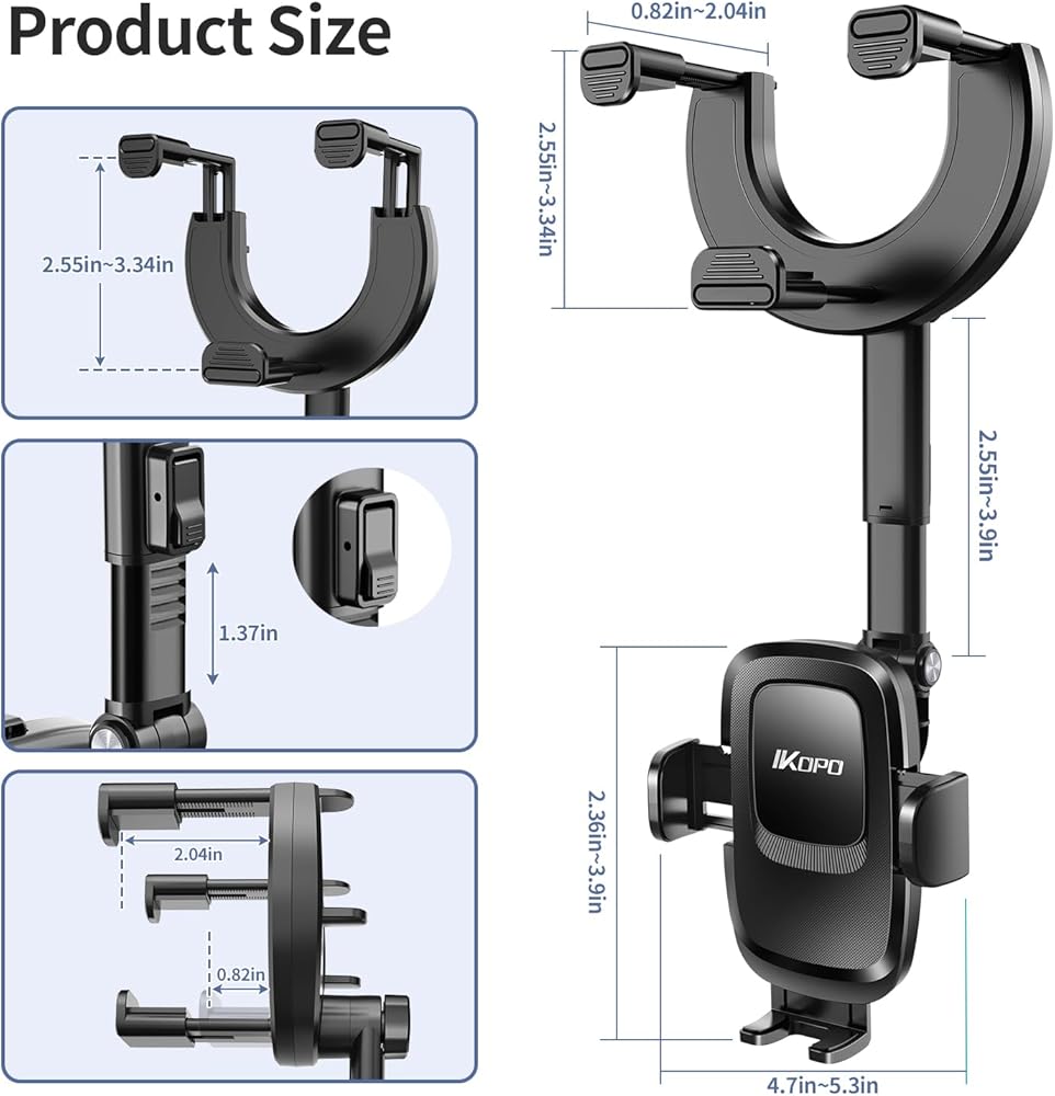 【تصميم لحامل هاتف مرآة الرؤية الخلفية الكبير للسيارة】بناءً على عيوب الطراز القديم، قمنا بترقية الذراع الثابت لمرآة الرؤية الخلفية إلى ذراع قابل للتمدد قابل للتعديل (من 5.9 بوصة إلى 7.7 بوصة). لذا فإن حامل الهاتف الخلوي هذا يناسب المزيد من مرايا الرؤية الخلفية بعرض 3.22 بوصة - 4.52 بوصة وسمك 0.94 بوصة - 2.28 بوصة.