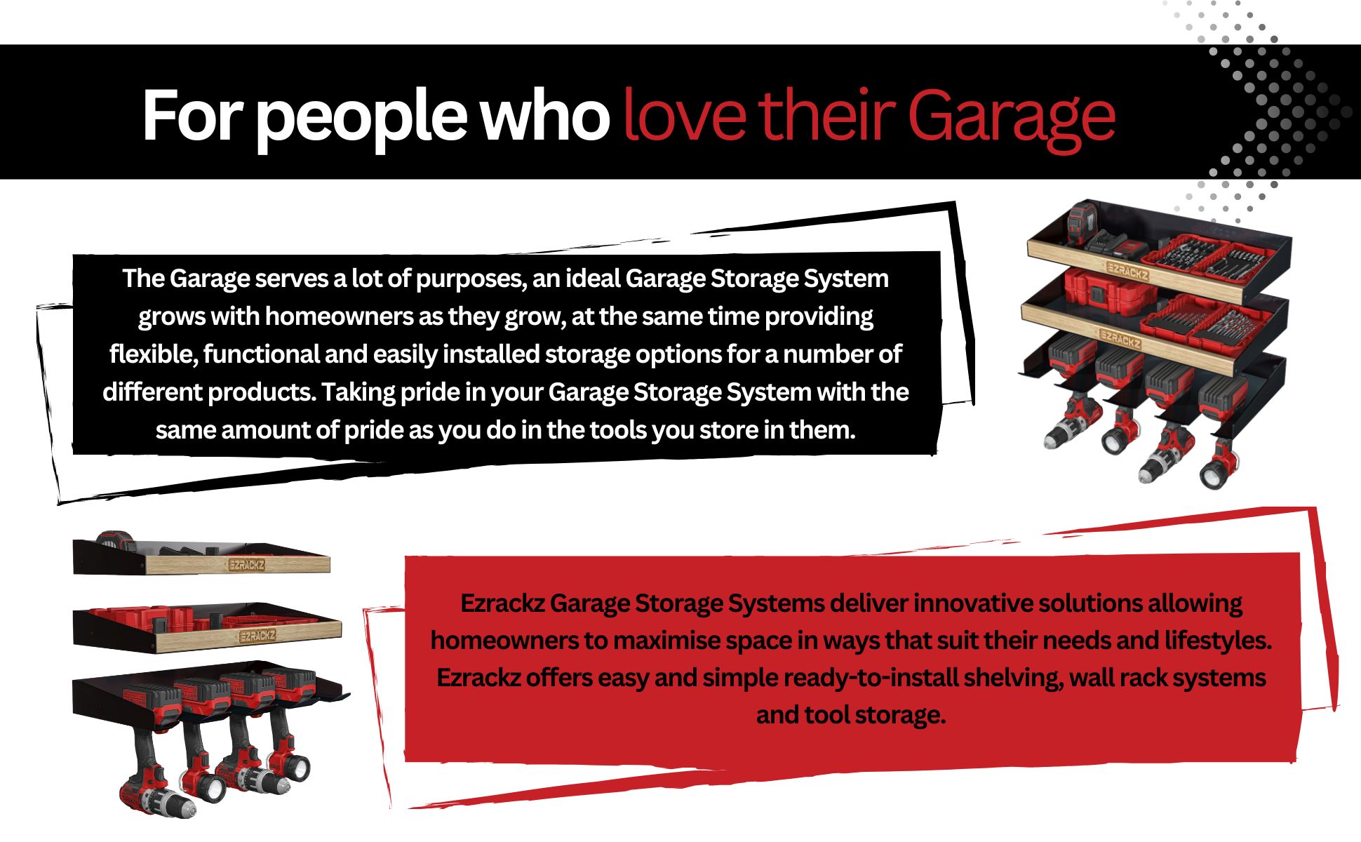 • قم بتنظيم مرآبك: يعد حامل المثقاب اللاسلكي Ezrackz بمثابة مغير لقواعد اللعبة لتنظيم المرآب وتخزينه. يسمح لك تصميمه الذكي بتخصيص وتنظيم جميع المثاقب اللاسلكية في مكان واحد مناسب. تضمن ميزة التثبيت على الحائط بشماعة المثقاب تخزين المثاقب الخاصة بك بأمان وأمان. إنه ليس مجرد منظم، بل هو أداة تحول مساحة العمل الخاصة بك إلى بيئة أكثر إنتاجية وكفاءة. جرّب الفرق مع حامل منظم البطارية على الحائط من Ezrackz.