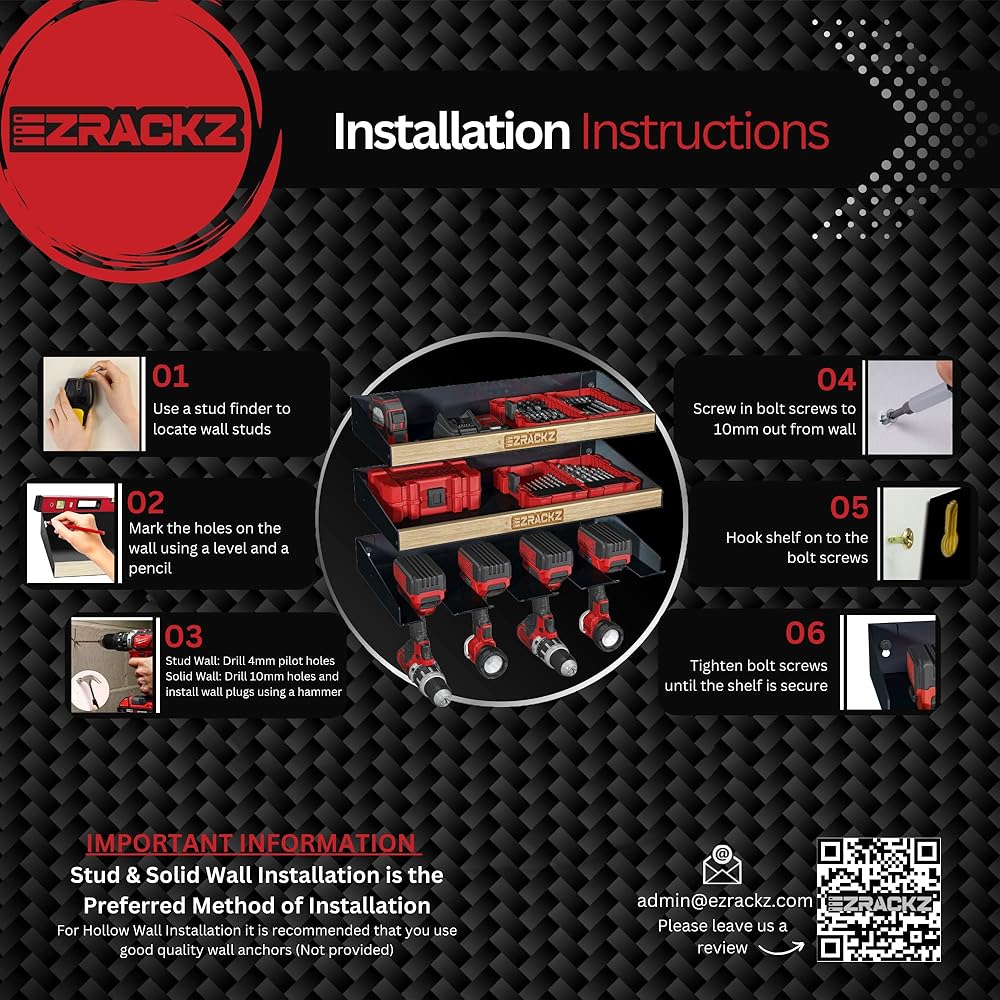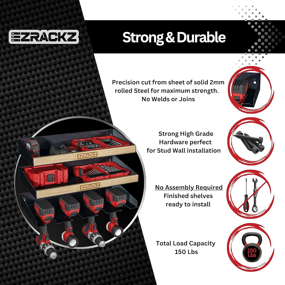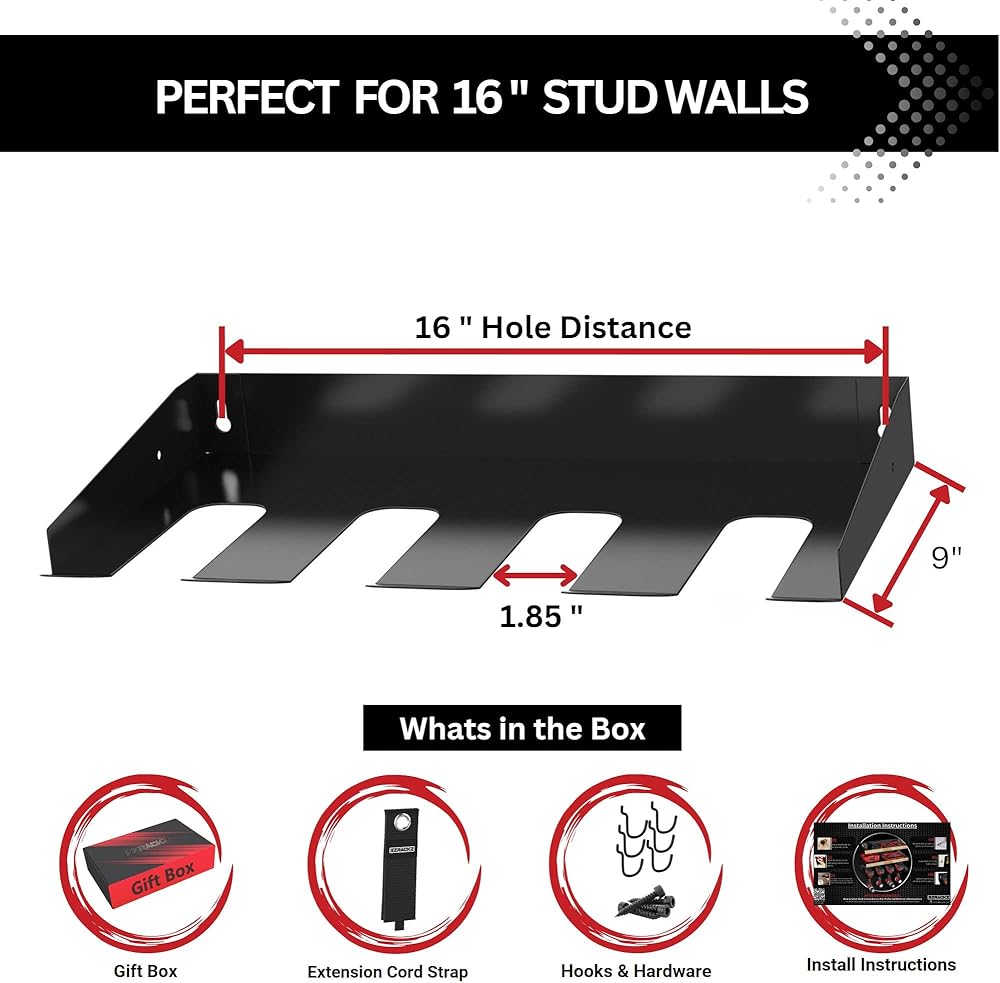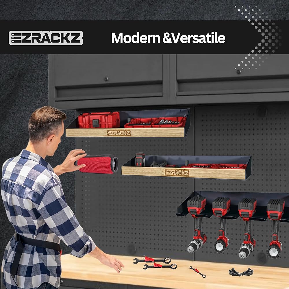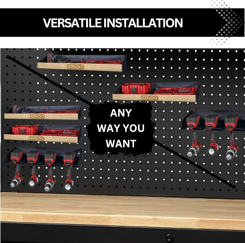 • التنوع والمتانة: تم تصنيع رف الأدوات الكهربائية هذا من مواد متينة لتحمل وزن أدواتك وقسوة مساحة العمل الخاصة بك. تتيح ميزة حامل الأدوات اللاسلكي سهولة الوصول إلى المثاقب اللاسلكية الخاصة بك، بينما تضمن ميزة التثبيت على الحائط لحامل الأدوات الكهربائية تثبيت أدواتك بشكل آمن في مكانها. إنه أكثر من مجرد منظم، إنه شهادة على قوة التنظيم وإمكانات الإنتاجية. قم بترقية المرآب الخاص بك باستخدام منظم الأدوات الكهربائية Ezrackz.