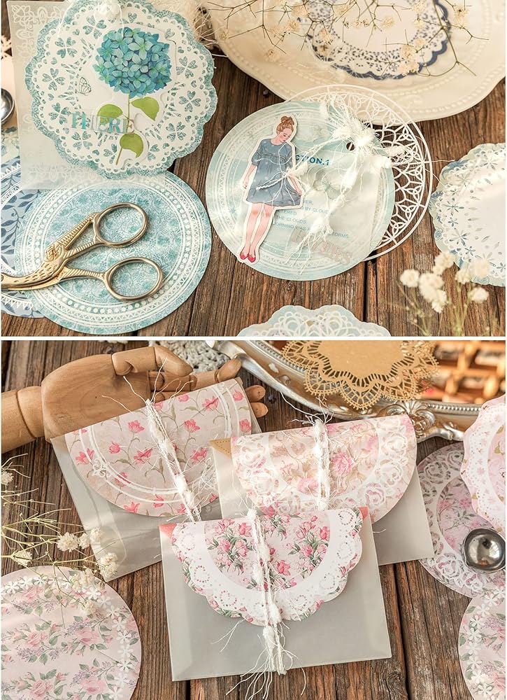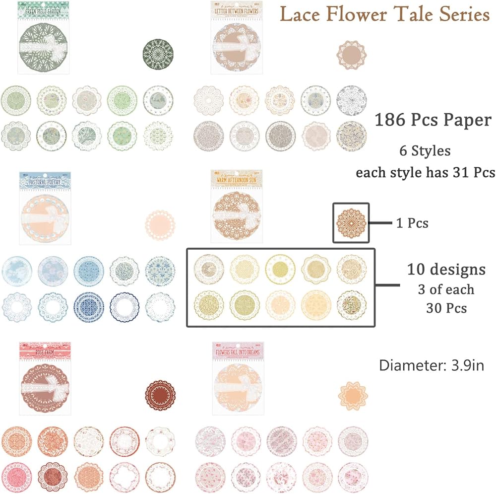 ورق الدانتيل الزهري: سوف تحصل على 6 عبوات من ورق تزيين سجل القصاصات، تحتوي على 6 أنماط مختلفة، 31 قطعة من كل نمط، 186 قطعة إجمالاً.
