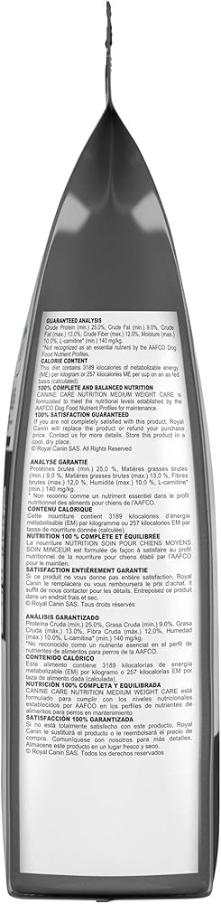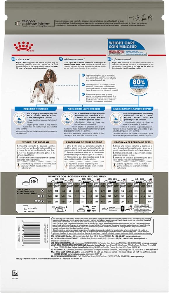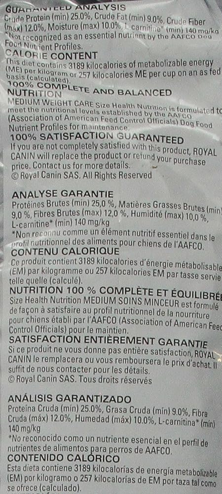 Heavy panting after walks? Constantly sluggish and quick to tire? Issues walking up or down stairs? When your medium breed dog carries extra weight around, it can slow them down. If you've been looking for a diet that tastes great to help your slightly overweight dog lose weight, Royal Canin Medium Weight Care Adult Dry Dog Food for Medium Breeds can help. Royal Canin Medium Weight Care Adult Dry Dog Food for Medium Breed Dogs is formulated for medium-size dogs that have a tendency to gain weight. It delivers the nutrition and support they need, featuring an ideal fiber blend to help keep them feeling full, while maintaining a healthy weight. This adult dog food helps slightly overweight dogs achieve an ideal weight, while delivering a delicious-tasting dog kibble. This weight control formula was created with medium breeds and mid-size dogs in mind, and is formulated to support an ideal body condition and lean muscle mass. In fact, 80% of slightly overweight dogs that were fed this dry food lost weight within two months. With over 50 years of scientific research and observation, Royal Canin continues to deliver targeted nutrition to feed every pet's magnificence. Not satisfied? Then neither are we. Our formulas are 100% satisfaction guaranteed. (Just contact us for more details.)