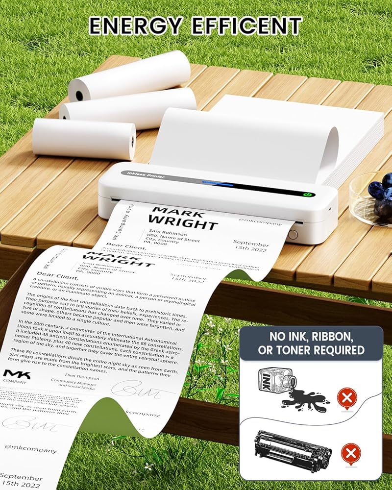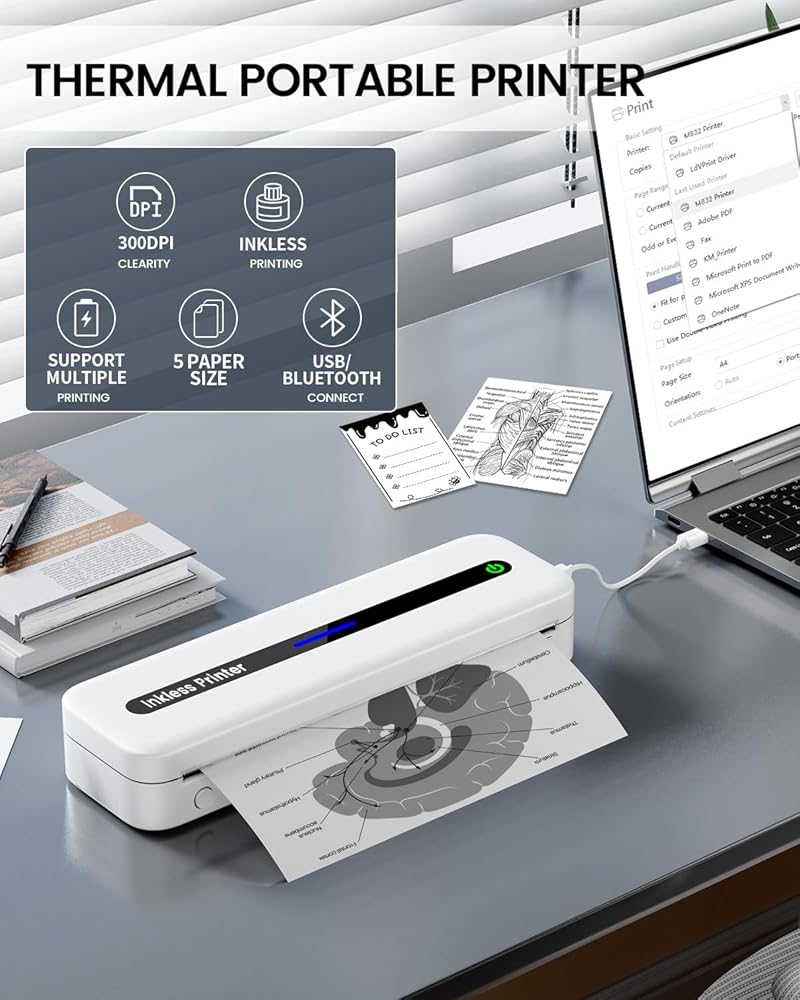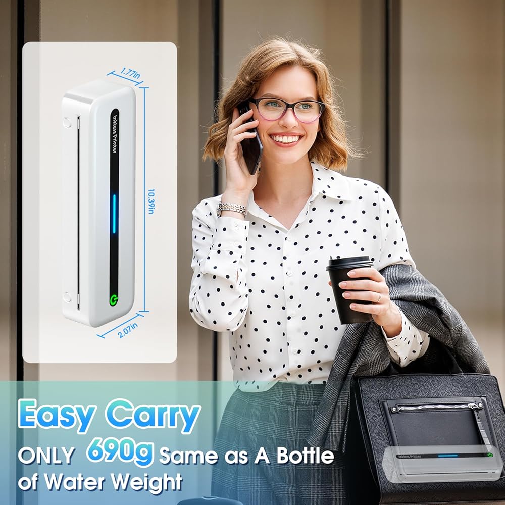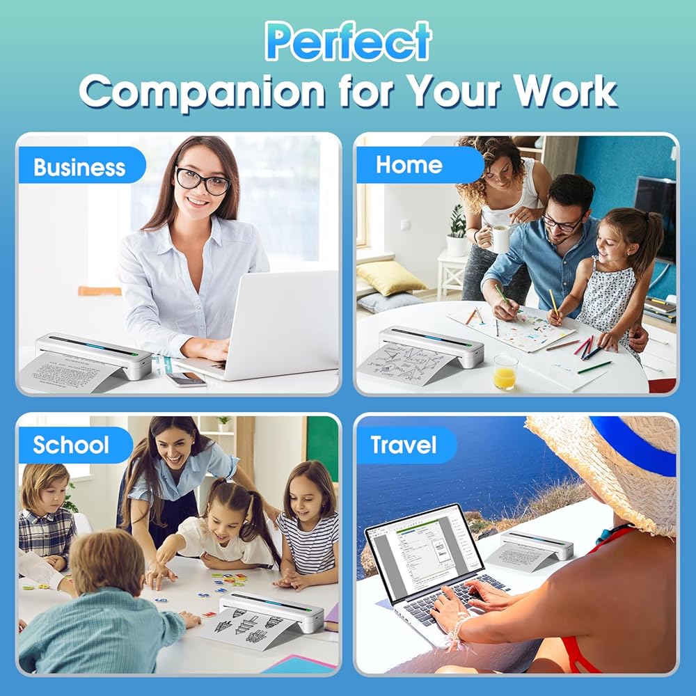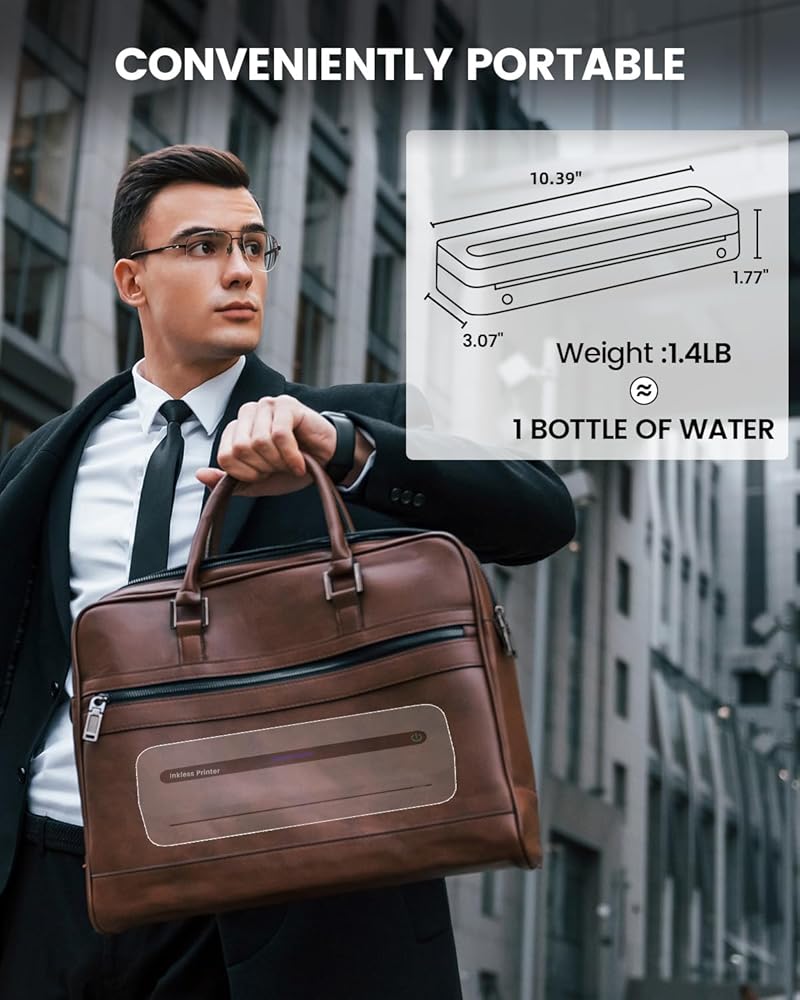 سهلة الحمل والنقل: استمتع بسحر طابعة السفر ASprink M832. موفرة للمساحة! بفضل حجمها الصغير (10.39 بوصة × 3.07 بوصة × 1.77 بوصة)، يمكنك بسهولة طباعة المستندات والرسومات ومختلف المحتويات الأخرى أثناء التنقل، سواء كان ذلك لأغراض العمل أو الترفيه، مما يضمن الطباعة في الوقت المناسب.