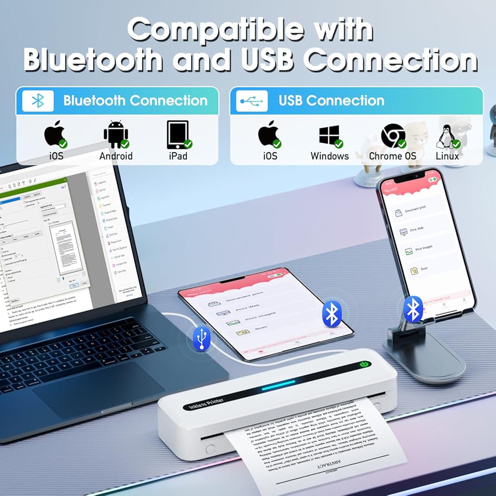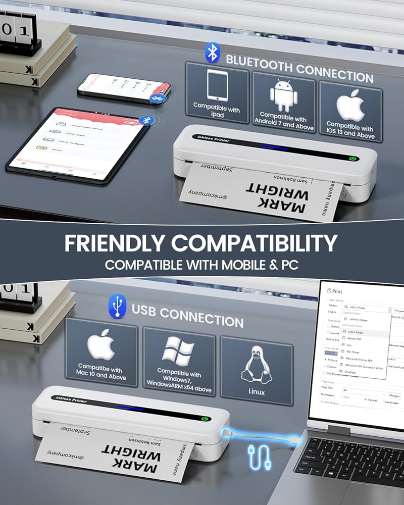 توافق ودود: للهواتف - احصل على طباعة لاسلكية حقيقية! تعمل طابعة البلوتوث اللاسلكية هذه متوافقة مع أنظمة iOS وAndroid والأجهزة اللوحية عبر البلوتوث. بالإضافة إلى ذلك، بالنسبة لأجهزة الكمبيوتر - قم بتوصيل USB فقط، المتوافقة مع أنظمة Windows وMac وLinux وWin ARM.طباعة في اي وقت وفي اي مكان!