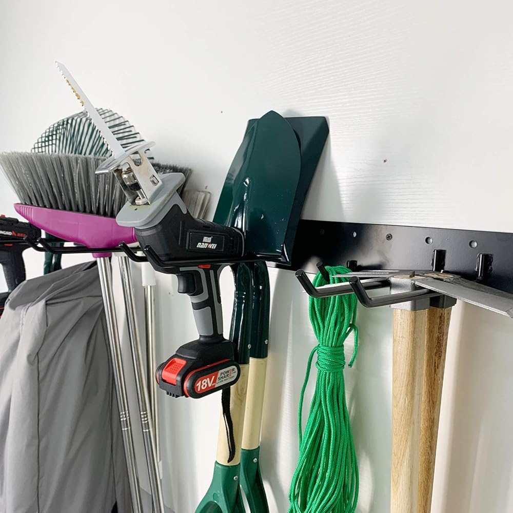 تطبيقات واسعة: مناسبة لتنظيم أدوات المرآب أو أدوات الحديقة وجميع أنواع الأدوات. مثل المشط، والمجارف، ومكانس الدفع، والدراجات، والحقائب، والمناشف، والأرواب، وأحذية المطر وغيرها من الأدوات اليدوية، وما إلى ذلك. يمكنك استخدامها لتعليق كل الأشياء التي تريد تنظيمها. نظام تخزين المرآب لتخزين وحمل أدوات حديقتك أو المرآب أو الشقة أو غرفة المرافق أو الطابق السفلي أو السقيفة.