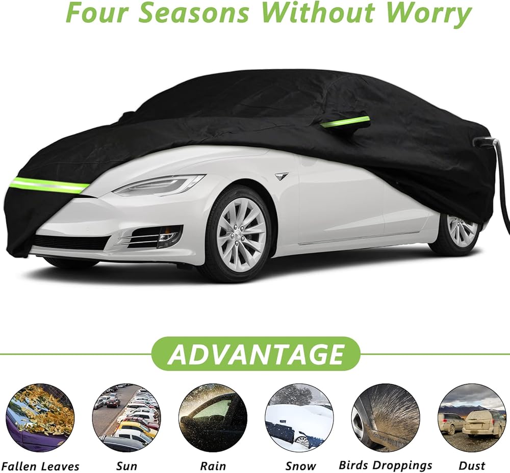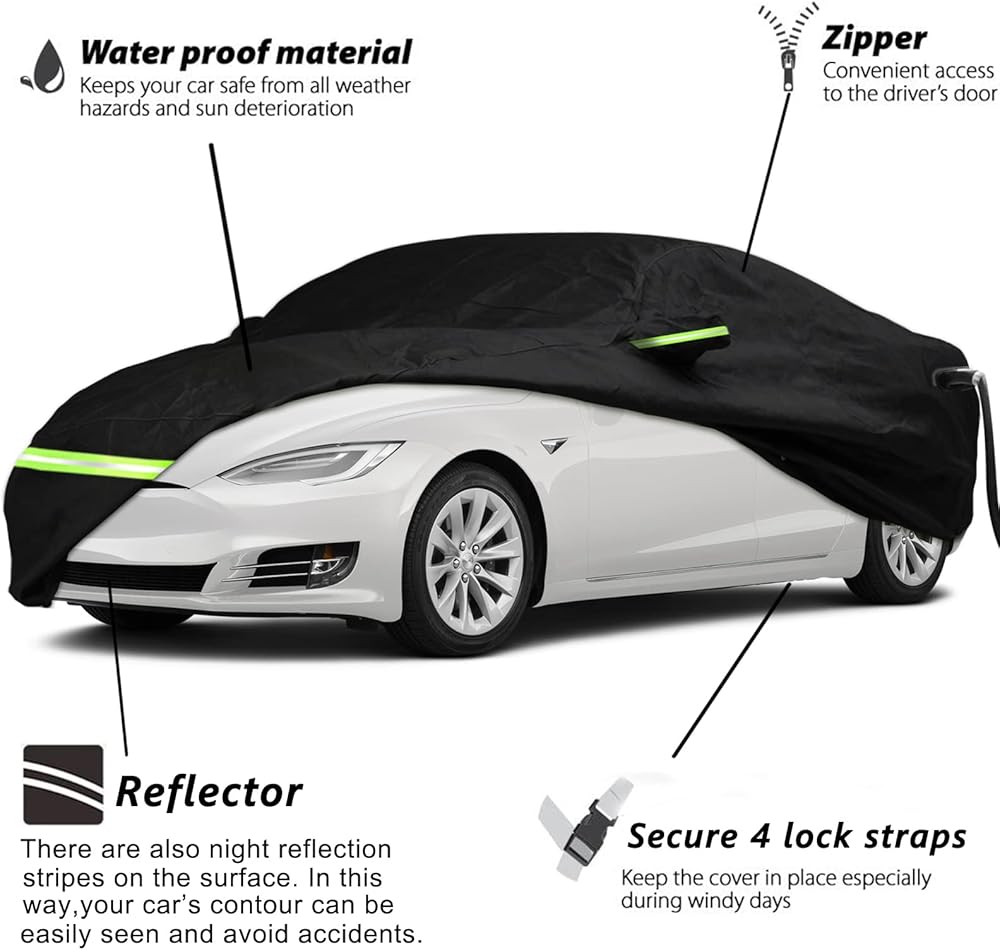 YIXIN for Tesla Model X 2020 2021 2022 Cars Cover, Your Mobile Garage, Giving Your All-Weather, All-Season Protection Feature: STURDY MATERIAL: Durable Material Made of high quality and heavy weave Polyester Taffeta Cloth, durable, no faded, UV resistant and 100% waterproof. The polyester taffeta material will be thinner, the waterproof effect is extremely strong, and the storage is convenient Driver Double door zipper for easy access, Front Reflective Stripes for avoiding scratched at night. Technical Details Brand :YIXIN Package :Storage bag Fit Vehicles forTesla Model X 2020 2021 2022 Package Included: 1 X Cover 1 X Windproof buckle rope 1 X Storage Bag Why Choose YIXIN Car Cover Most people need a car cover because their cars are parked outdoor and suffered from rain, UV rays, snow, dust, dirt, and bird droppings. No worries, what we do is to protect your car from all of this. Our car covers give your vehicle all-round protection. This cover is superior to competitors' in many features. The 100% Waterproof to prevent rain into your car and protect your car from frozing in winter. Aluminum is good at Sunproof and UV Coating anti UV rays.