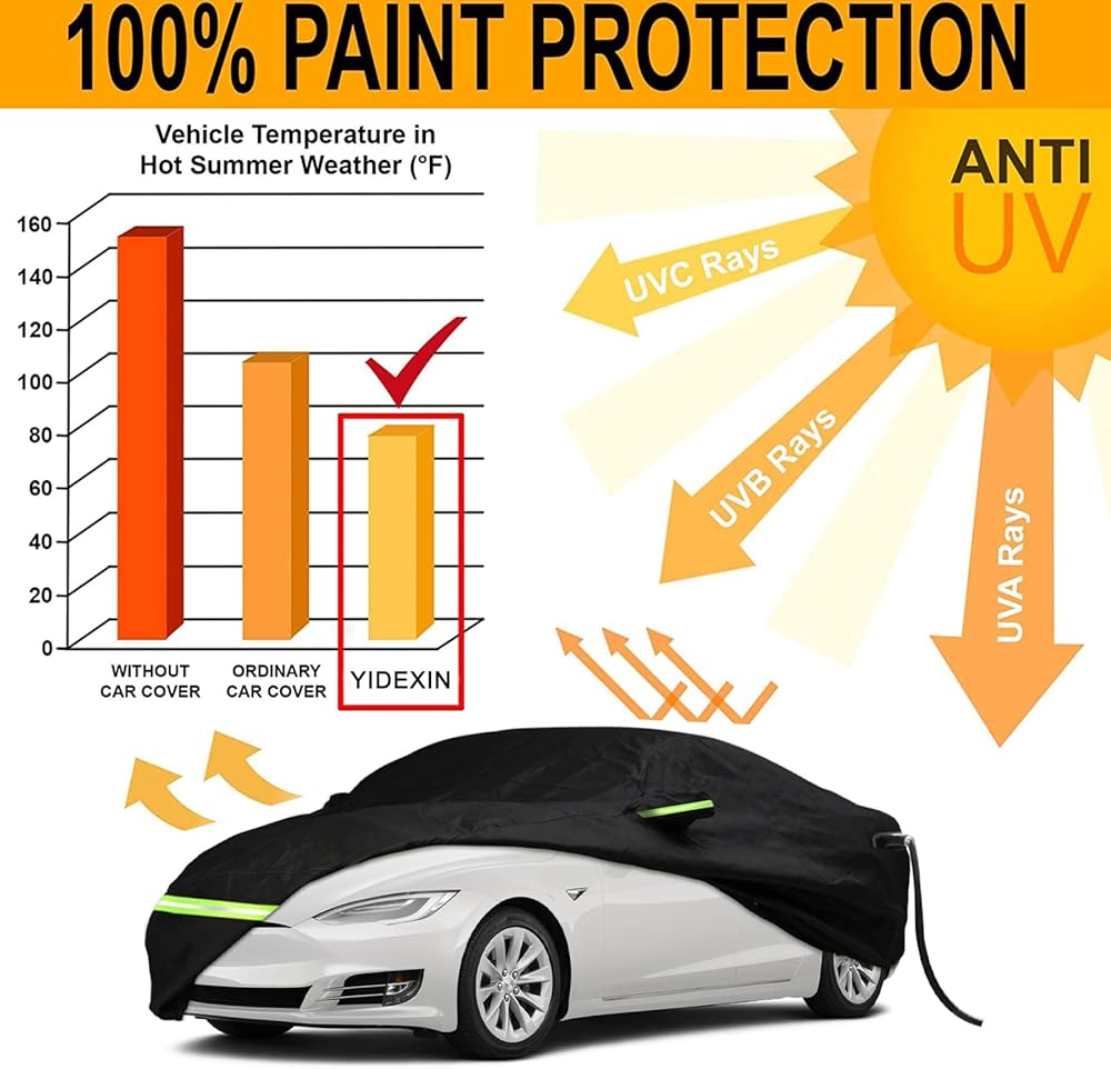 【STRONG MATERIAL】DURABLE MATERIAL: Made of high quality heavy duty woven polyester taffeta, durable, colorfast, UV resistant and 100% waterproof. YIXIN car cover will not tear or tear easily. 190T polyester taffeta can withstand water pressure up to 1500mm, escorting your car in rainy days. Suitable for outdoor and indoor use. Protect your car from UV rays. (The polyester taffeta material will be thinner, the waterproof effect is extremely strong, and the storage is convenient)