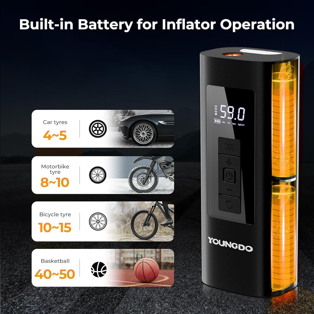 ضاغط الهواء المحمول في إطارات Youngdo ، 150 رطل و 6000 مللي أمبير في الساعة ، نفخ الإطارات مع مقياس الضغط ، والتضخم السريع للسيارة ، والدراجات النارية ، والدراجة ، والكرات ، والقابلة لإعادة الشحن عبر USB-C مثل Torch و Power Bank