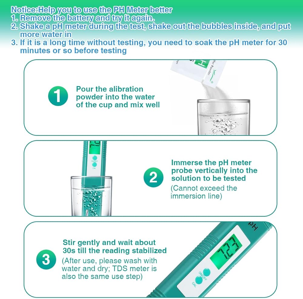 Simple Calibration Operation:Provide 3 sets of ph calibration powder,easy to calibrate,provide ph 4.00,6.86 and 9.18PH calibration powder is more accurate than test paper.The large backlit lcd display is easy to read.The hand-held pen style makes it easy to put in a pocket or bag and can be carried anywhere.