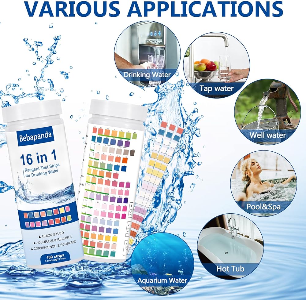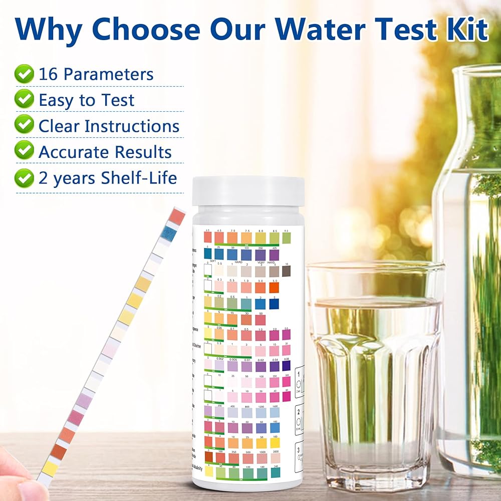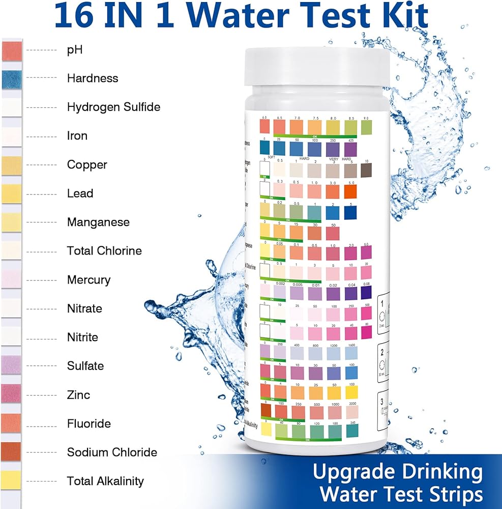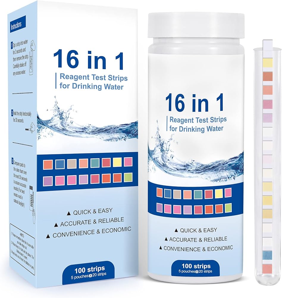 مجموعات اختبار مياه الشرب للبئر: مجموعة اختبار المياه 16 في 1 لاختبار جودة مياه الآبار المنزلية - عدد 100 شريط اختبار للمياه، اختبار سهل لصلابة الرصاص، ودرجة الحموضة، والفلورايد والمزيد