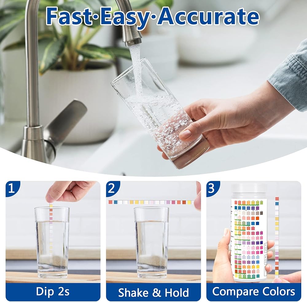 【EASY TO US】Only 3 Steps to know your home water quality. First, Dip a water test strip into water for 2 sec; Second, Hold horizontally for 30 sec; Third,Compare to the color chart and get the results. Get water quality information instantly.
