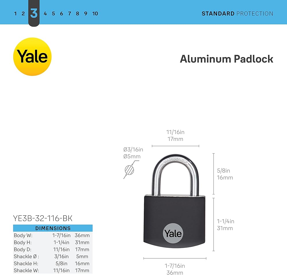 With 180 years of manufacturing expertise, an exclusive Yale design, and rigorous testing, the Yale Aluminum Padlocks are built with you in mind. Suitable for your gym locker, securing your toolbox or any belonging you want to keep safe and secure. Our padlocks are lightweight and come with a hardened steel shackle to prevent cutting and a protective cover on the body for scratch and corrosion resistance. Yale takes care of your possessions; you take care of the rest.