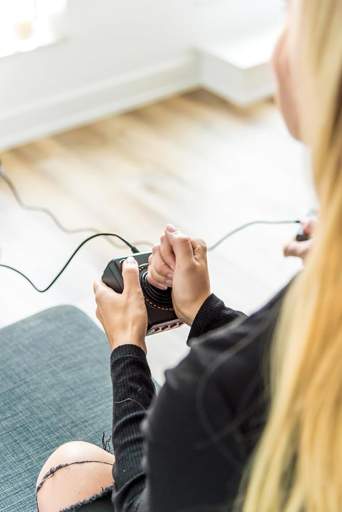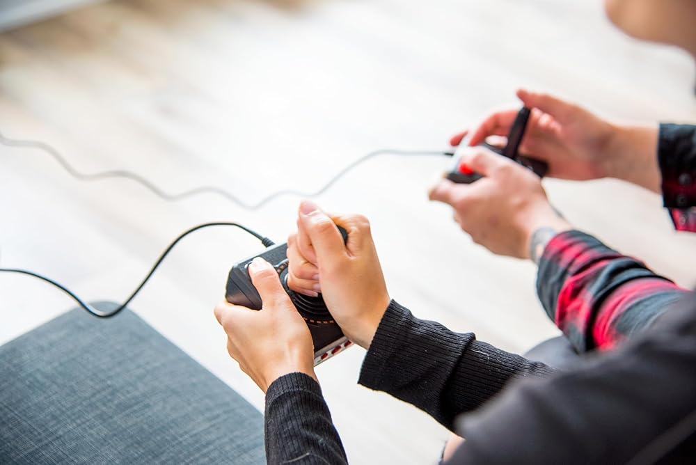 • The joystick is wired, not wireless, and includes red buttons on the side. There are no additional buttons. Wired paddles may not have the flexibility to move to the side of the TV, but this is consistent with the original gaming experience.