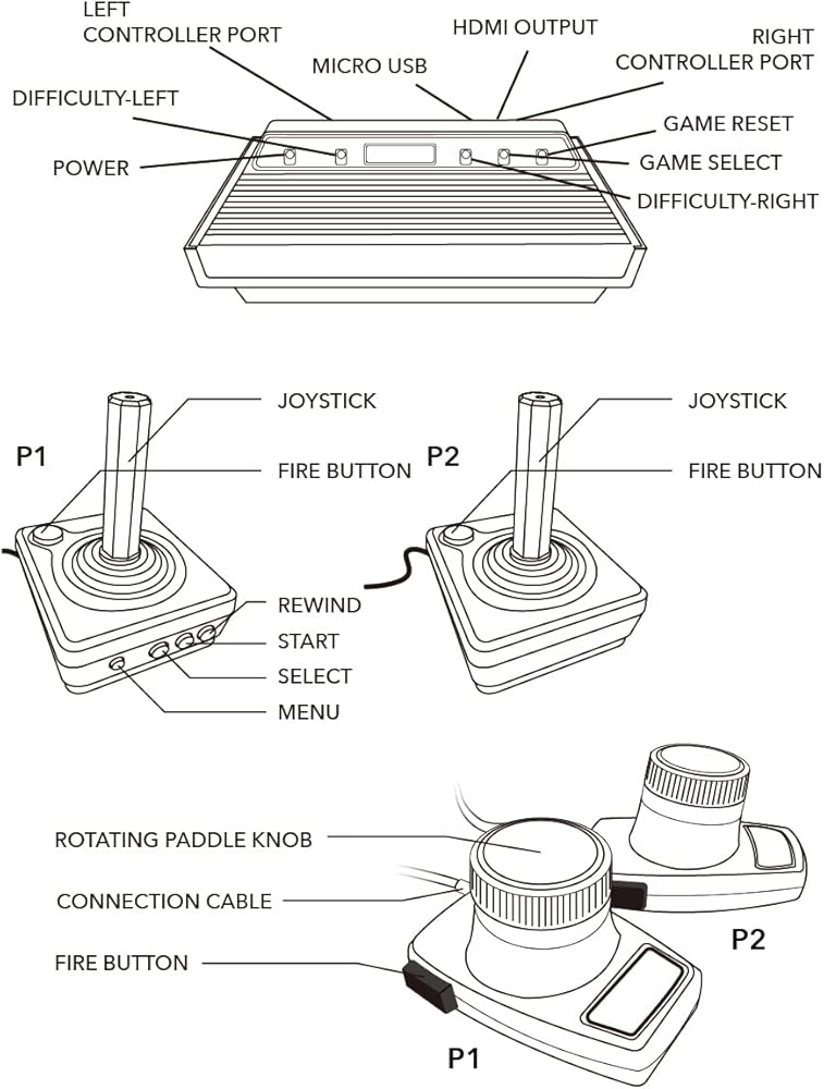 • This is a mini console, significantly smaller than the original Atari console. HDMI video output (720P) Plug & Play on HD TV (HDMI cable included). Save/Load/Rewind all games/Powered by Micro USB (adapter included).