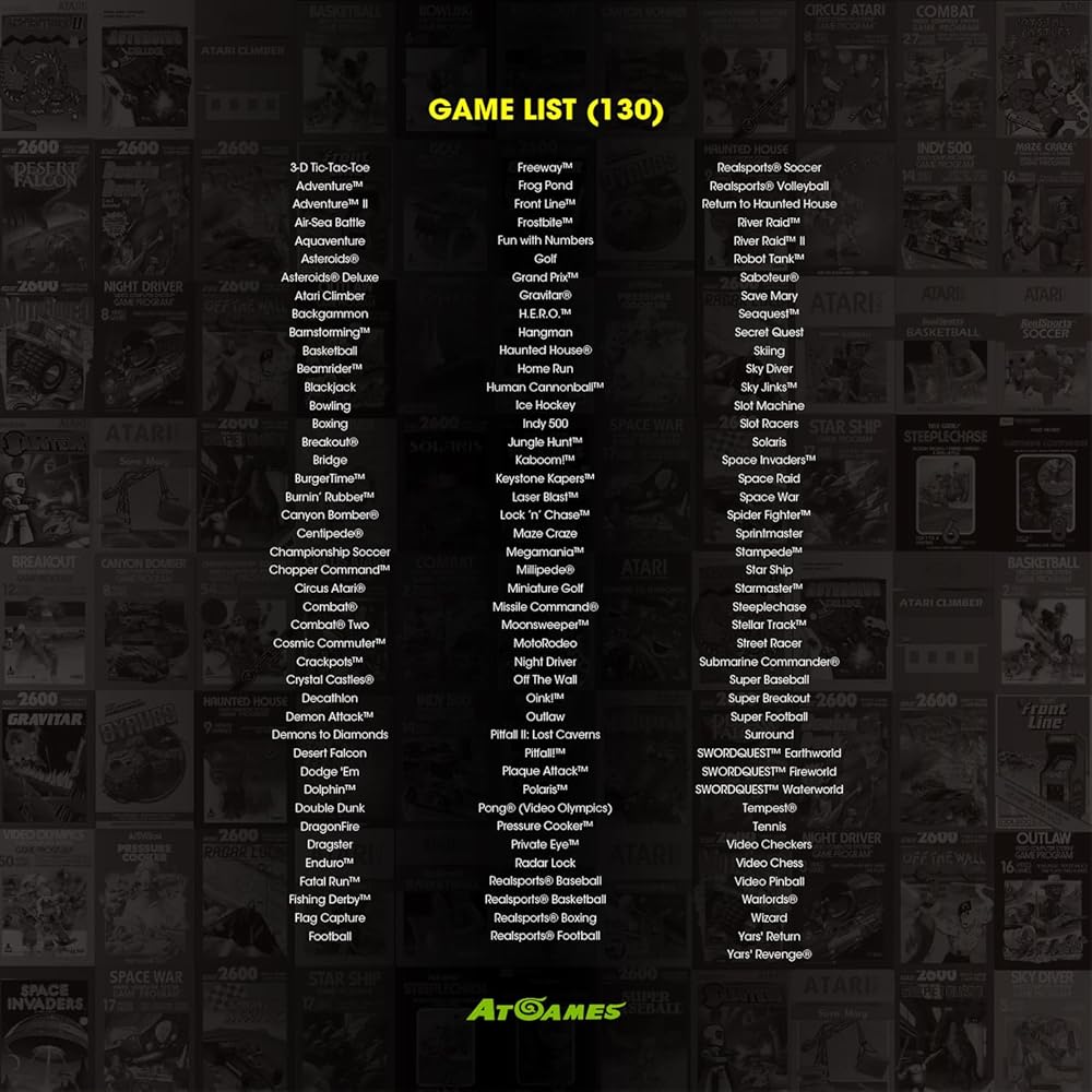 • Video game console with 130 Built-In games, including Atari 2600 classics like Asteroids, Centipede, and Missile Command, as well as other legends like Activision Pitfall and River Raid. Refer to the uploaded game list picture to find games of interest.