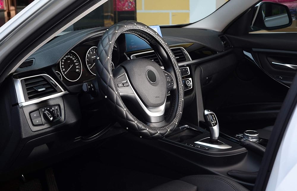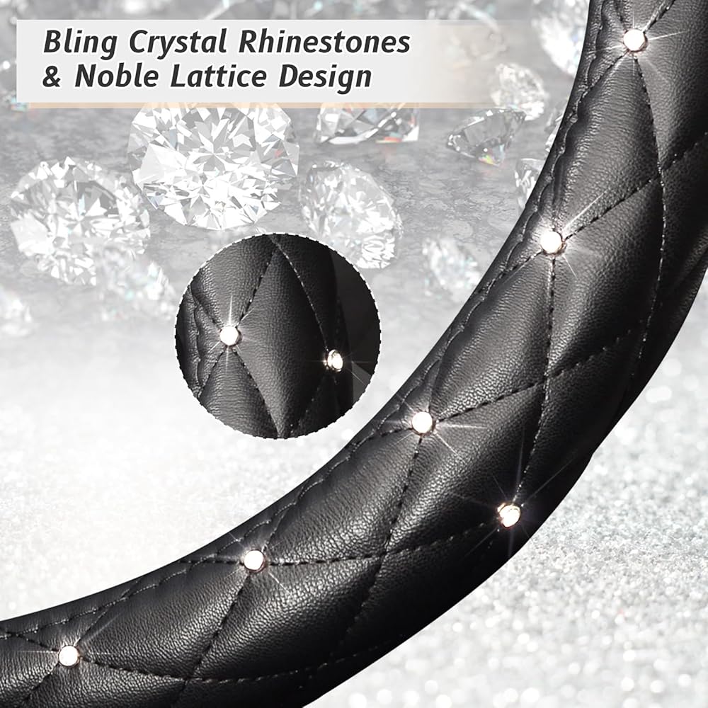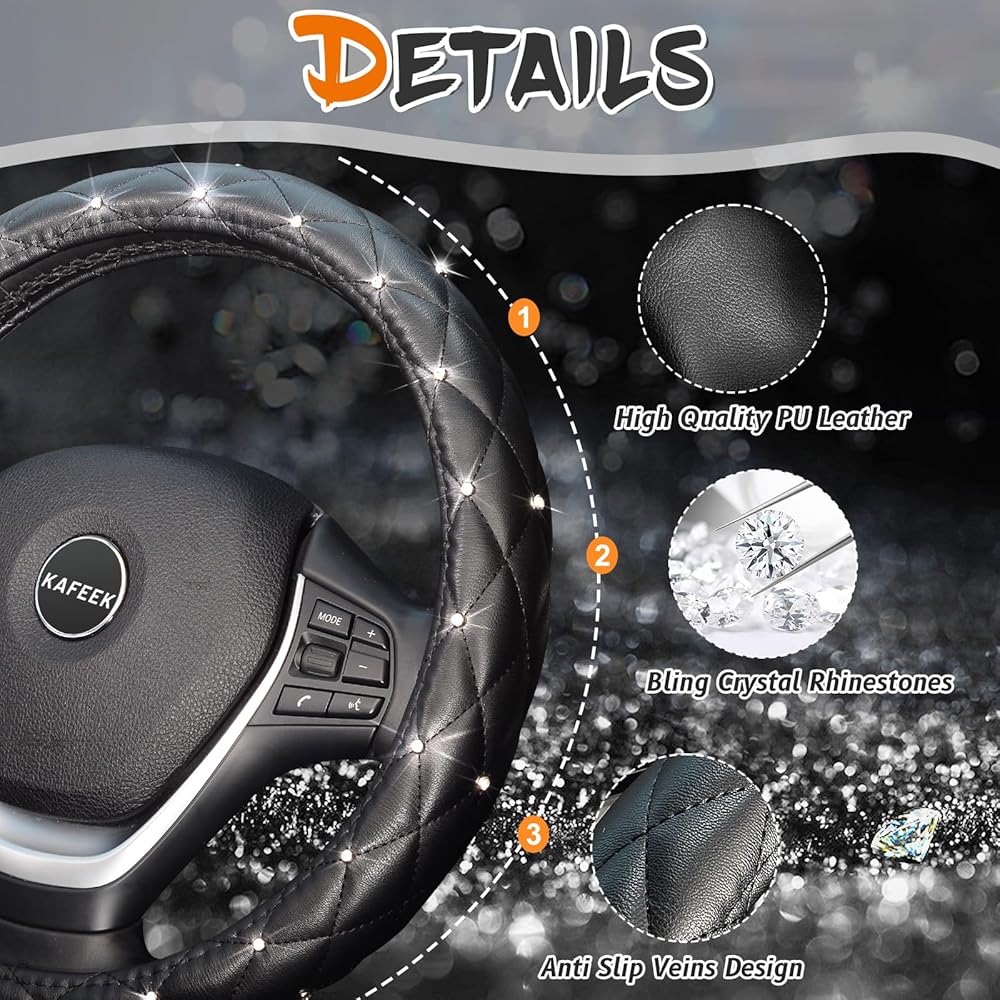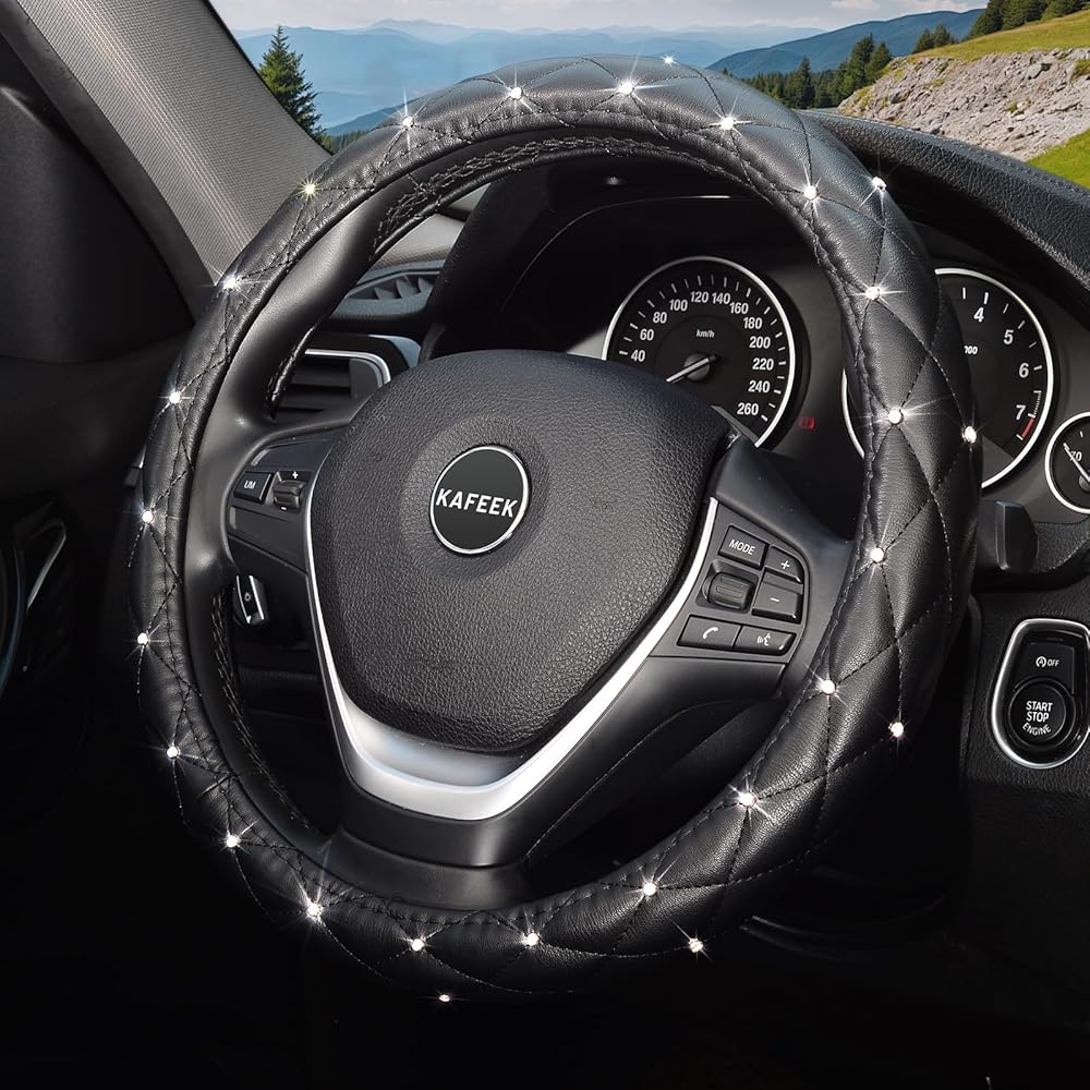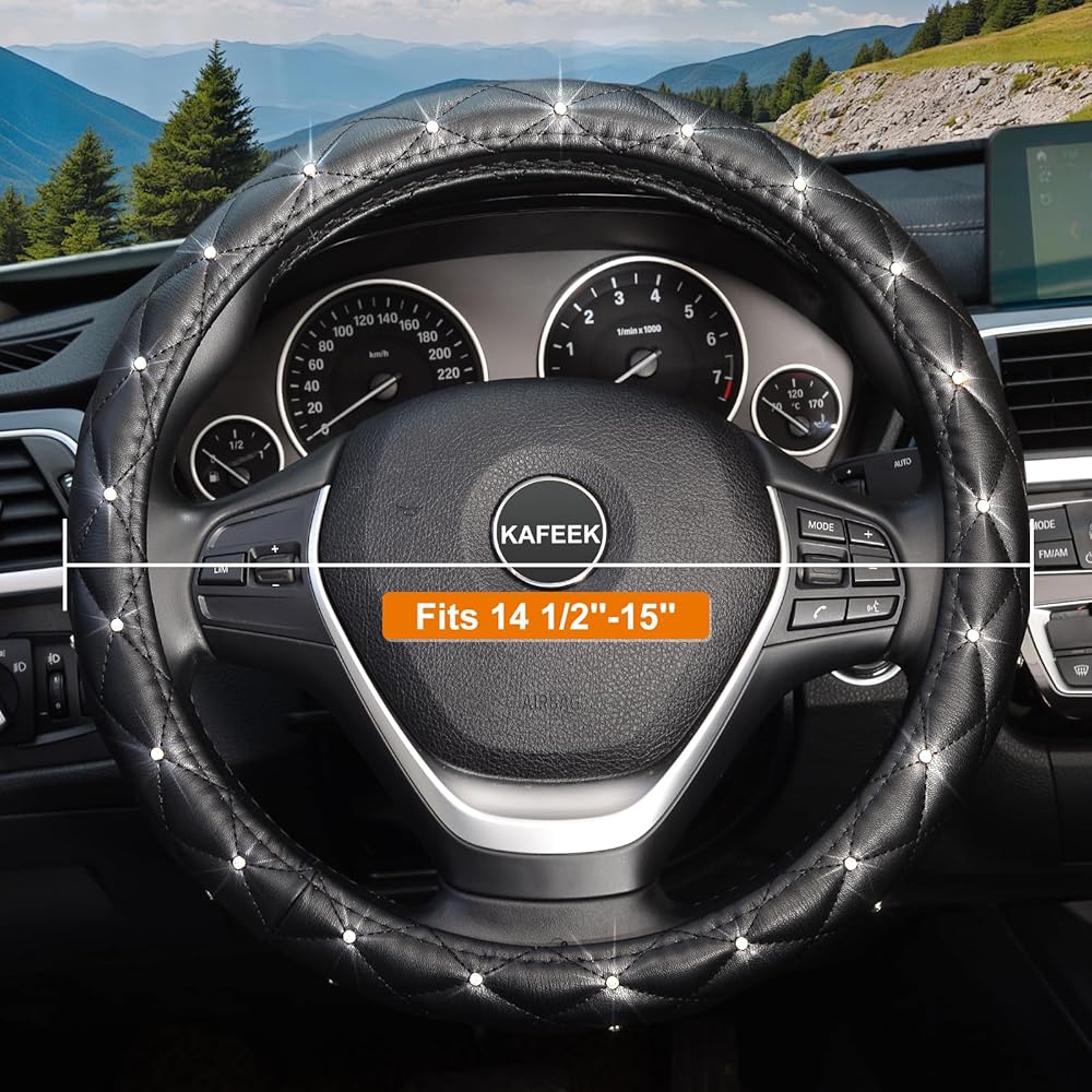 غطاء عجلة القيادة من الجلد الأسود الماسي من KAFEEK مع أحجار الراين الكريستالية اللامعة، مقاس 15 بوصة