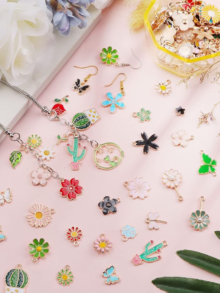 🌵 حلية على شكل زهرة: هناك 140 قطعة حلية زهور مختلطة مع 70 نمطًا مختلفًا، قطعتان من كل نمط. المعلقات غنية بالأساليب وكمية كافية لتلبية احتياجاتك اليدوية المتنوعة. يمكنك استخدامها لصنع مجوهرات الربيع الخاصة بك وفقًا لأنماطك الخاصة.