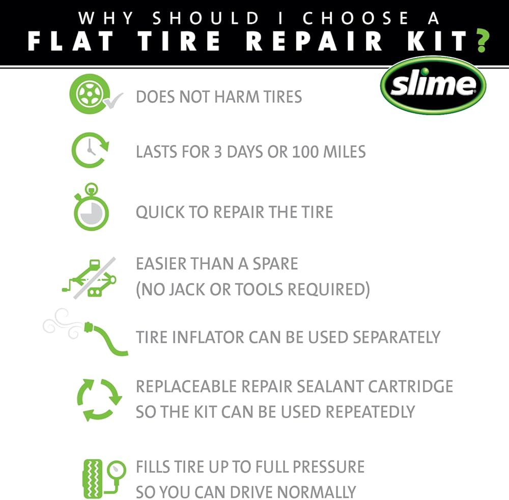 Tire repair with the push of a button! Stop struggling with a spare tire, or waiting for roadside assistance. Slime's Smart Spair Ultra Flat Tire Repair Kit quickly and easily gets you back on the road in just 10 minutes!