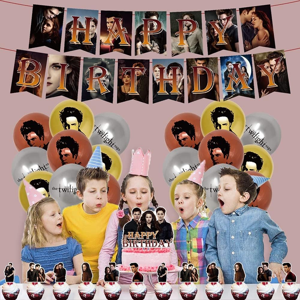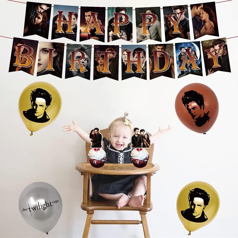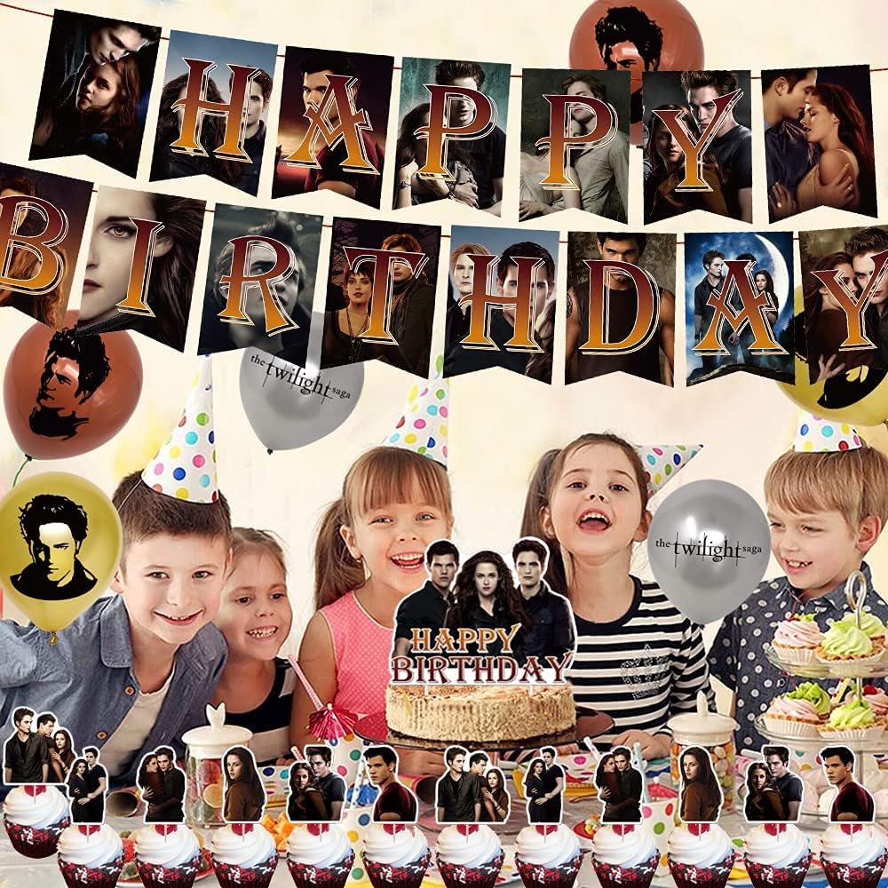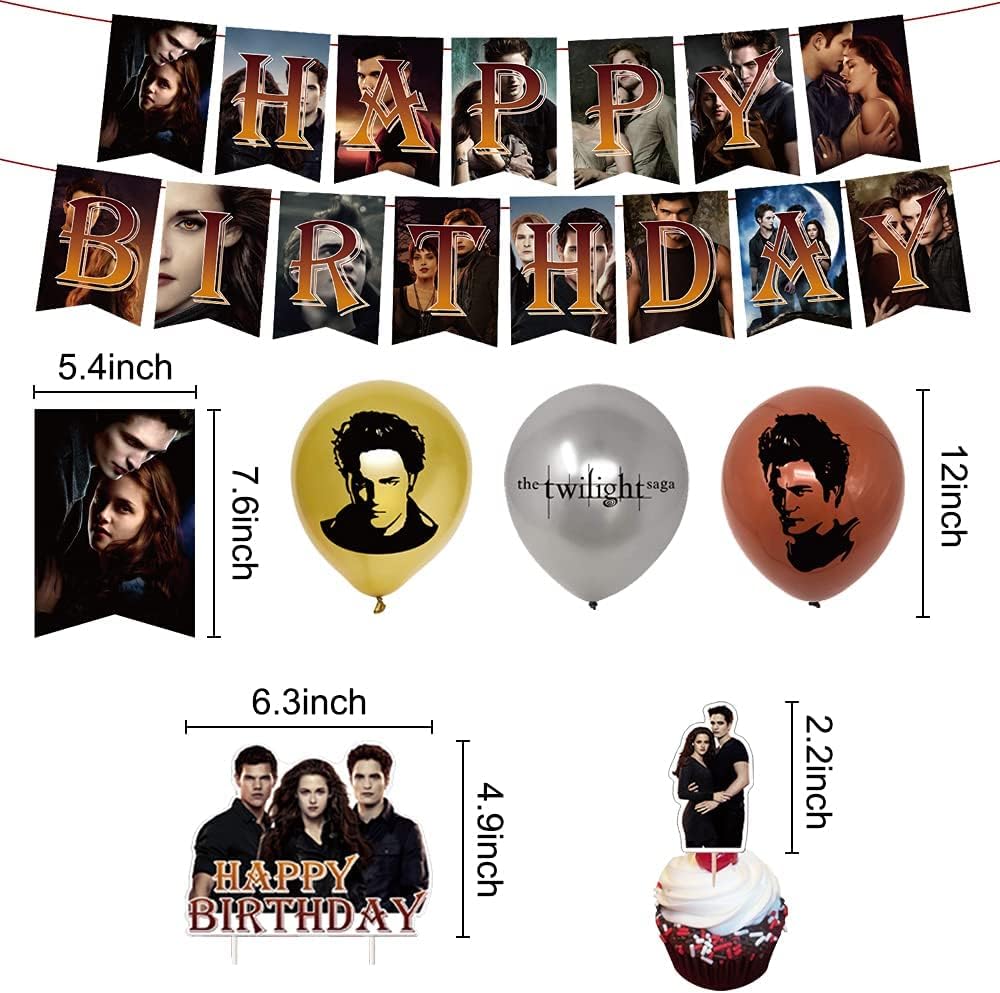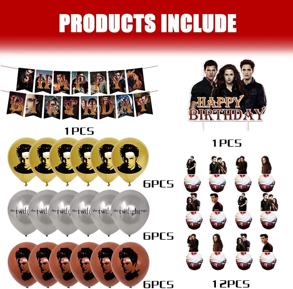 لوازم حفلات أعياد الميلاد Twilight Saga من QICI تتضمن ديكورات الحفلات ذات طابع Twilight Saga للمعجبين لافتة عيد ميلاد سعيد، وغطاء للكعك، و24 قطعة علوية للكب كيك و18 بالونة لاتكس