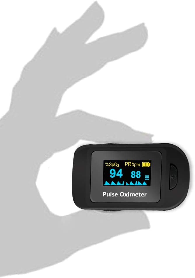 مقياس التأكسج النبضي بأطراف الأصابع، جهاز مراقبة تشبع الأكسجين في الدم (SpO2) مع قياسات معدل النبض ورسم بياني شريطي للنبض، شاشة قراءة رقمية محمولة OLED، البطاريات متضمنة
