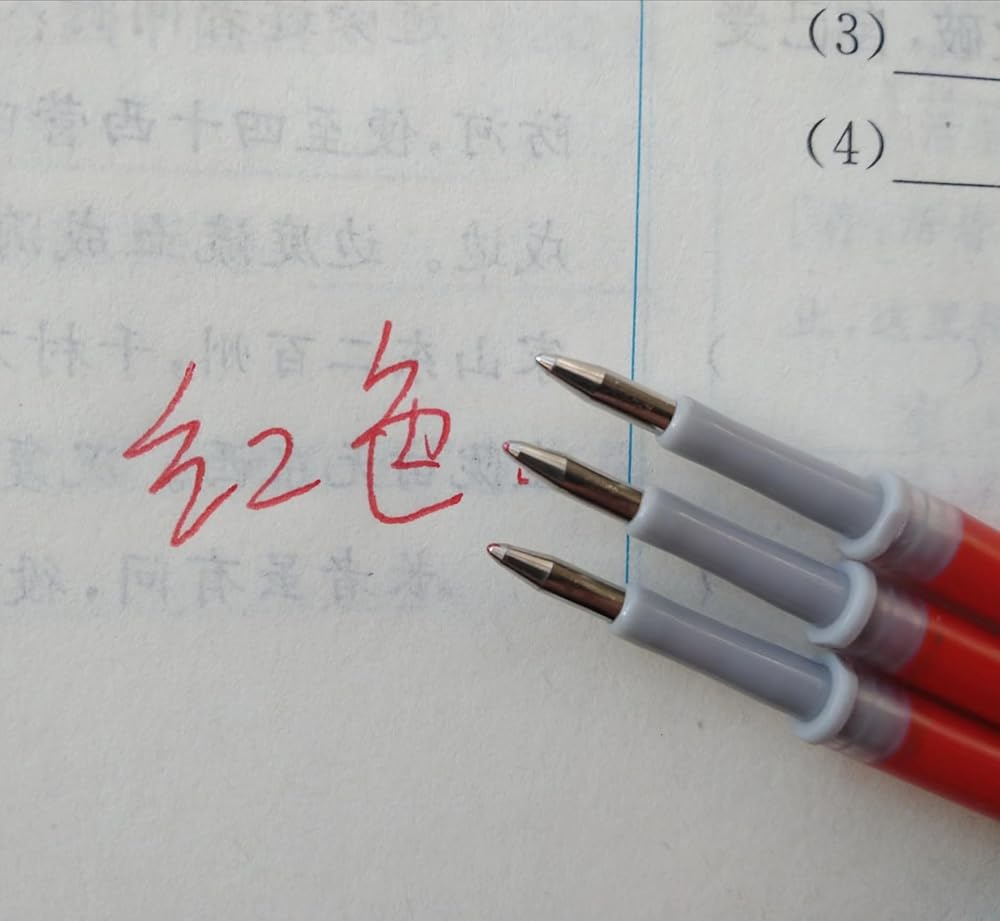 3 : Red liquid gel pen refill, k35 gel pen universal refill,0.5 mm fine pen tip, moderate thickness, smooth writing lines. The amount of ink in each pen is very sufficient, which makes you have a more lasting writing experience.