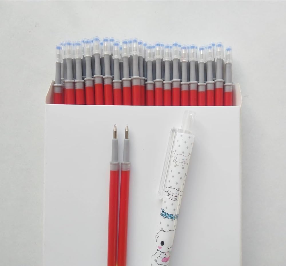 1: 50 pcs replaceable refills red ink,0.5 mm gel ink refills for retractable pens,0.5 mm gel ink refill.Send 1 extra pens.